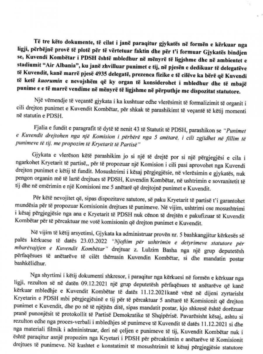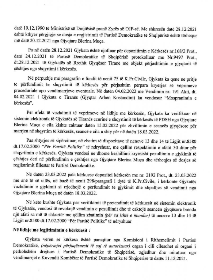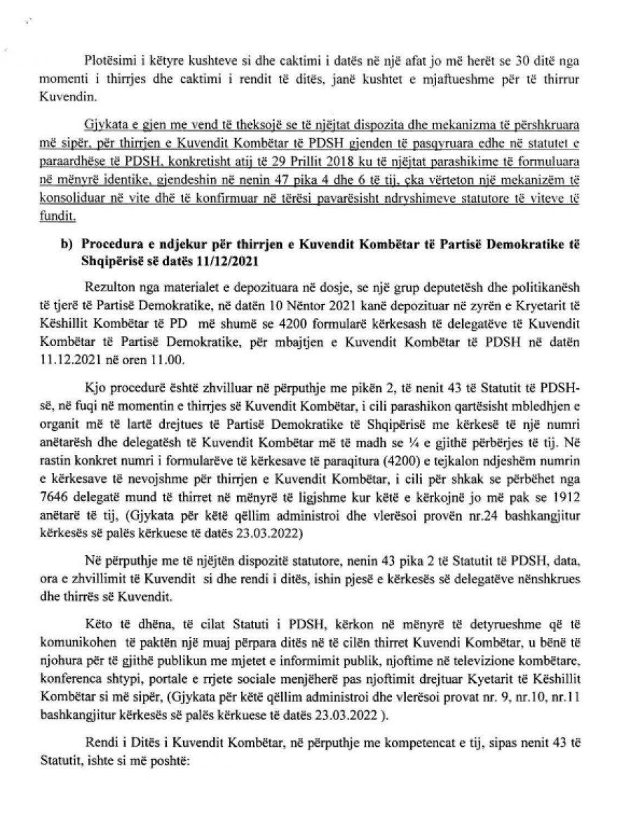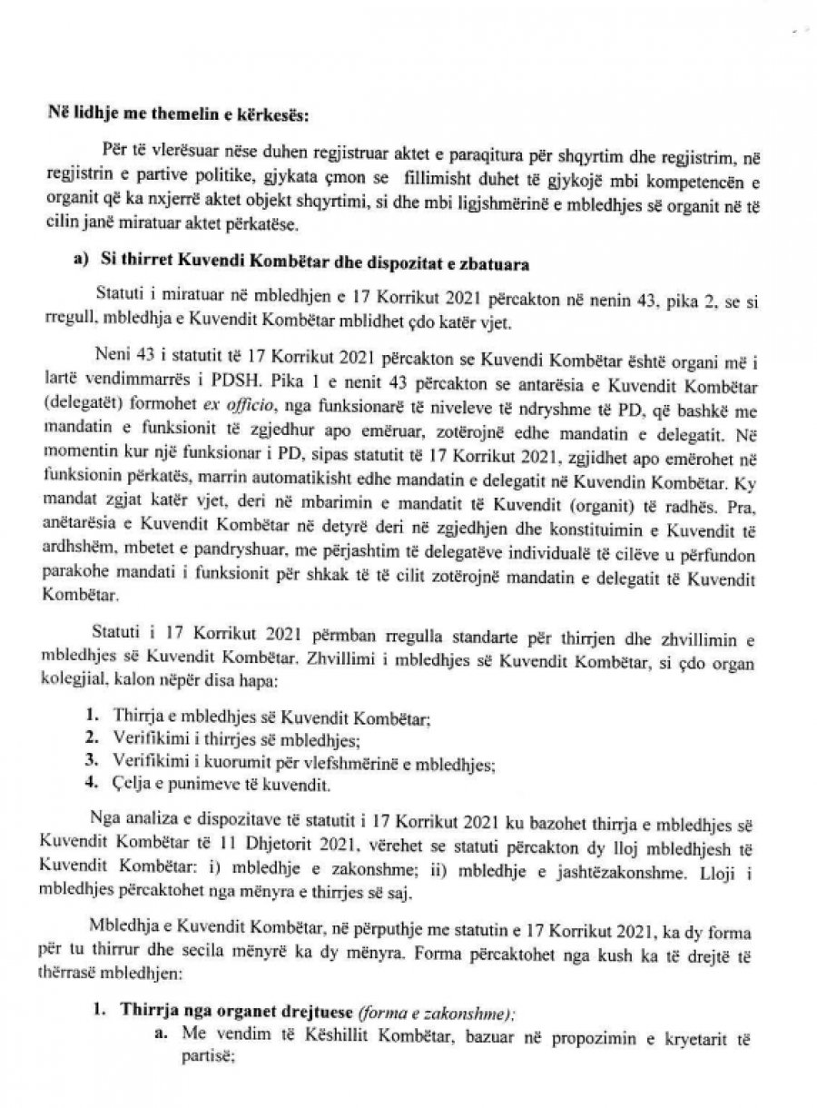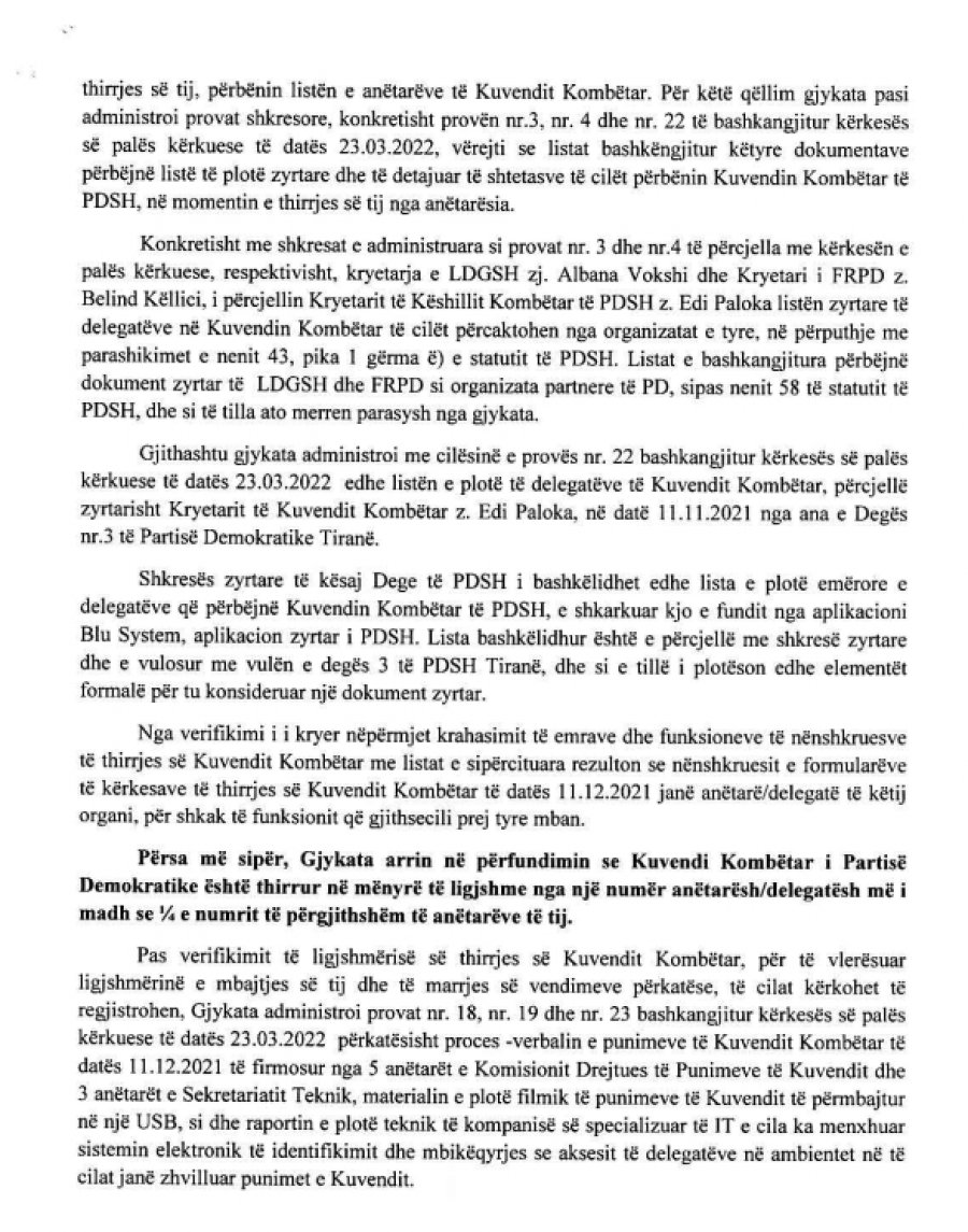 Në rastin e kërkesës së Komitetit të Rithemelimit, gjykata ka konstatuar se mbledhja e Kuvendit Kombëtar i 11 Dhjetorit 2021 është kryer në përputhje me Statutin e Partisë Demokratike që ishte në fuqi në atë kohë.