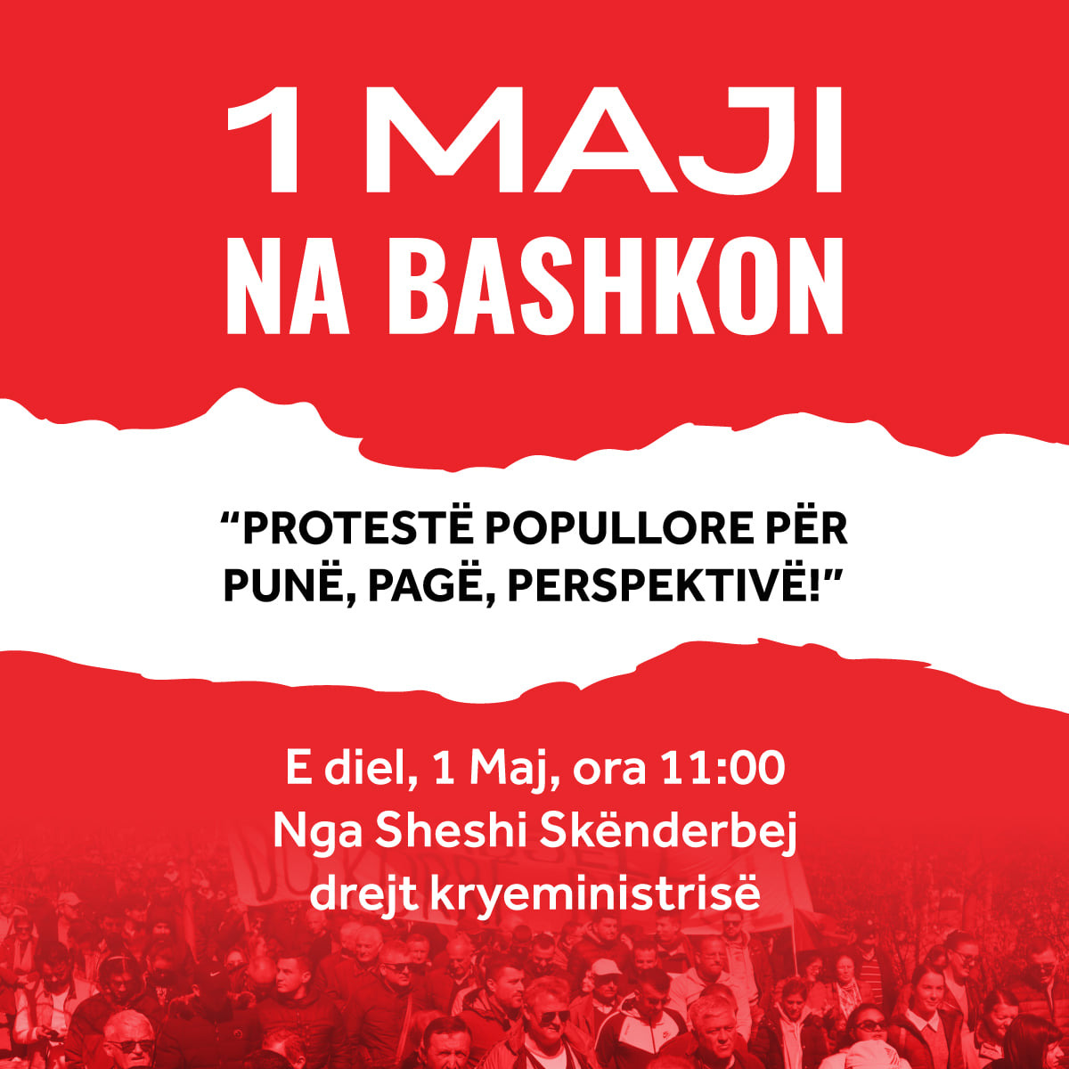 “1 Maji na bashkon. Protestë popullore për punë, pagë, persektivë”, thuhet në posterin e shpërndarë.