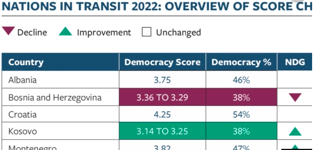 Në një shkallë vlerësimi nga 1 deri në 7 pikë, ku 1 është shkalla më e ulët e demokracisë, sipas raportit të sivjetshë, Kosova shënoi një përparim nga 3,14 pikë sa kishte në raportin paraprak, në 3.25.