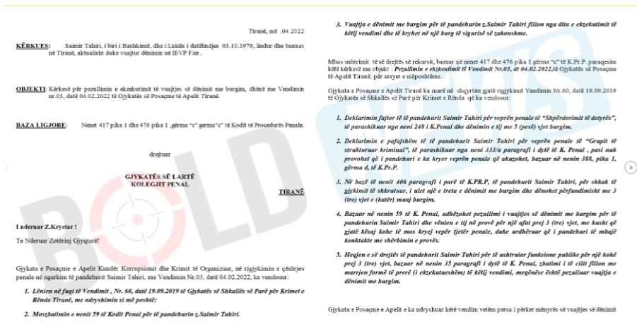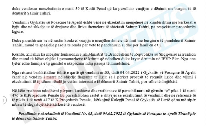 “Vendimi i Gjykatës së Posaçme të Apelit është vënë në ekzekutim menjëherë në kundërshtim me kërkesat e ligjit dhe në shkelje të të drejtave dhe lirive themelore të shtetasit Saimir Tahiri, pa respektuar procedurën ligjore. Duke parashtruar se në rastin konkret vuajtja e menjëhershme e dënimit me burgim e të pandehurit Saimir Tahiri, mund të sjellë pasoja të rënda për vetë të pandehurin si dhe për familjen e tij. Kështu, Z.Tahiri ka mbajtur funksionin e ish Ministrit të Brendshëm të Republikës së Shqipërisë ai rrezikon dhe mund të bëhet objekt i personazheve të krimit që ndodhen duke kryer dënimin në IEVP Fier”, thuhet në kërkesë.