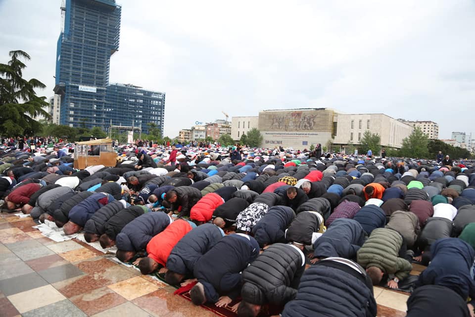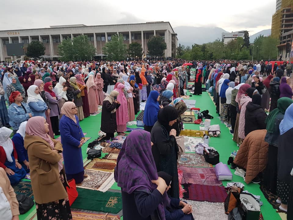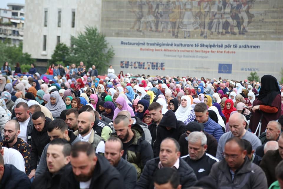 Me mijëra besimtarë myslimanë kanë mbushur sot sheshin Skëndërbej në Tiranë, edhe pse ishte një mëngjes i lagësht.