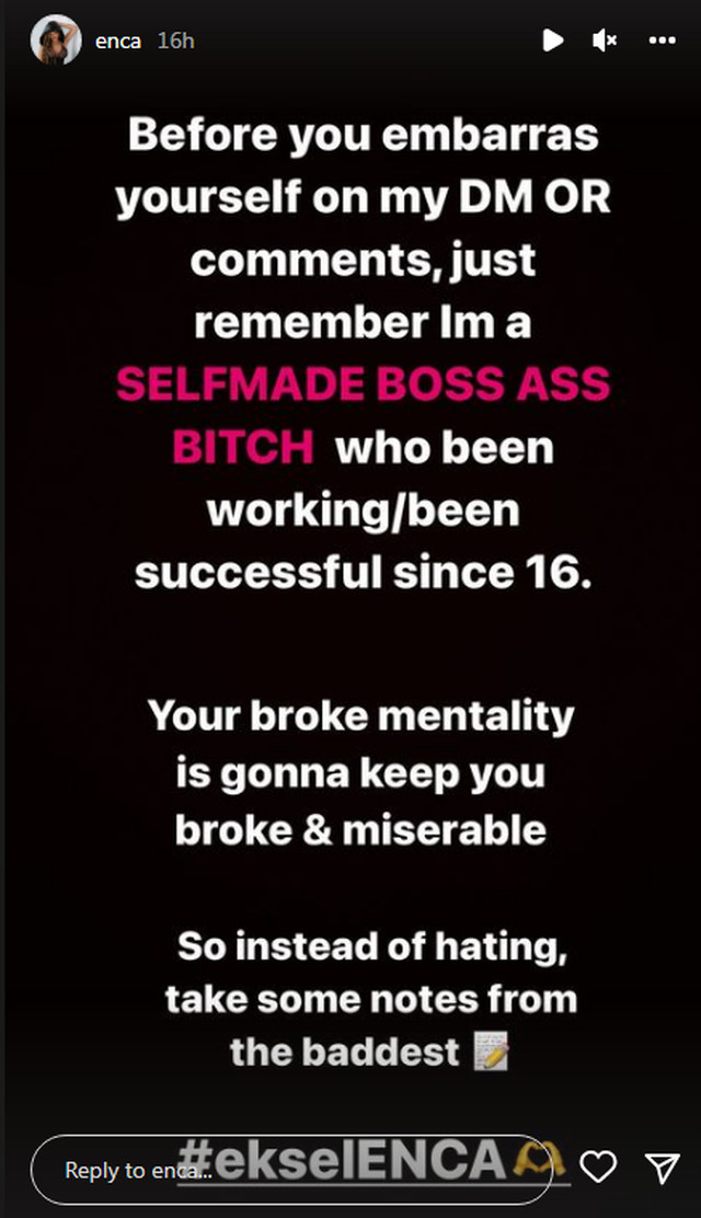 Lidhur me reagimet e shumta në rrjetet sociale, Enca ka bërë disa postime në “Instastory”, ku është shprehur së suksesi i saj është falë talentit dhe punës që në moshë të vogël.