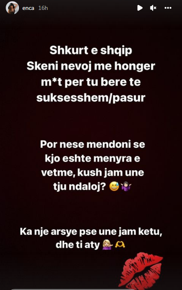 Shkurt e shqip s’keni nevojë me ngrënë m*t për t’u bërë të suksesshëm/pasur. Por nëse mendoni se kjo është mënyra e vetme, kush jam unë t’ju ndalojë? Ka një arsye pse unë jam këtu dhe ti aty”- shkruan Enca.