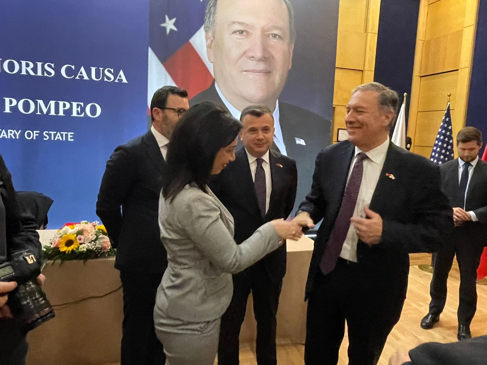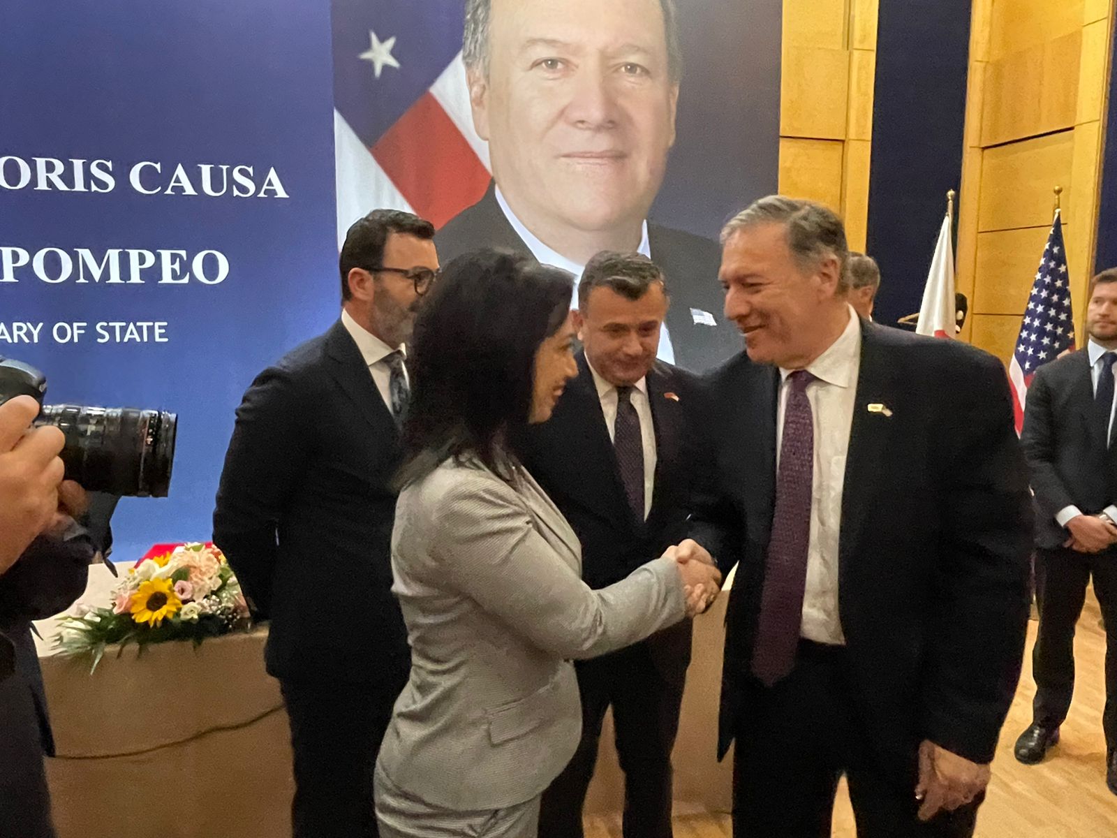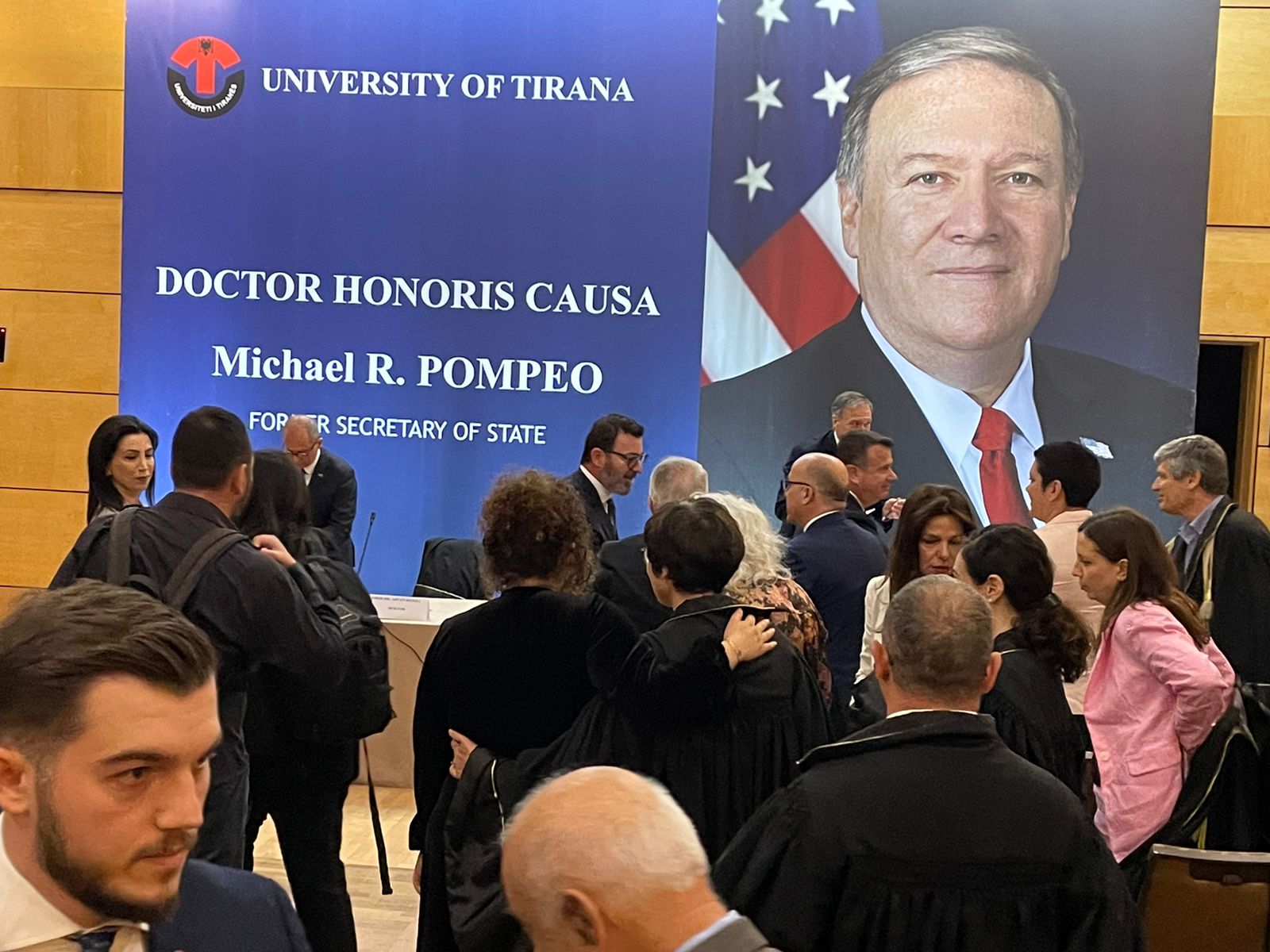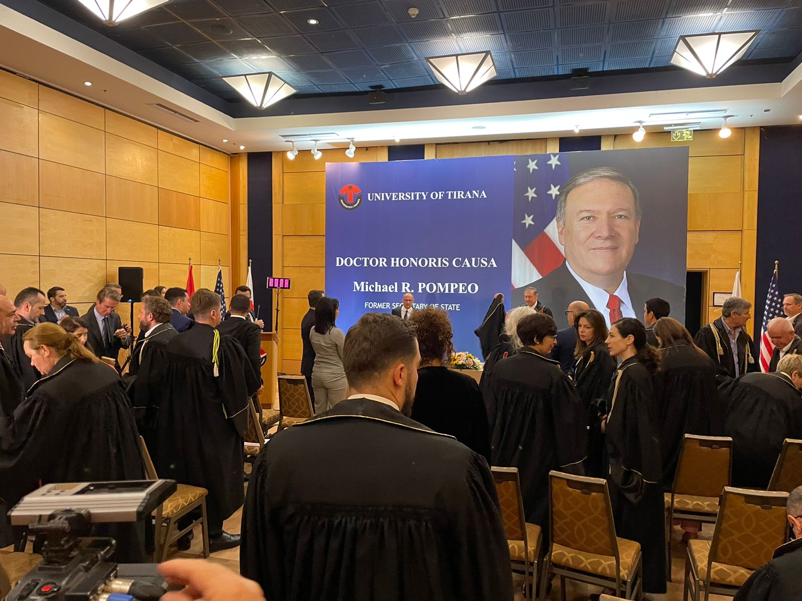 Ish-sekretari amerikan i Shtetit Mike Pompeo gjatë vizitës së tij në Tiranë, është nderuar me titullin “Doktor Honoris Causa” nga Universiteti i Tiranës.