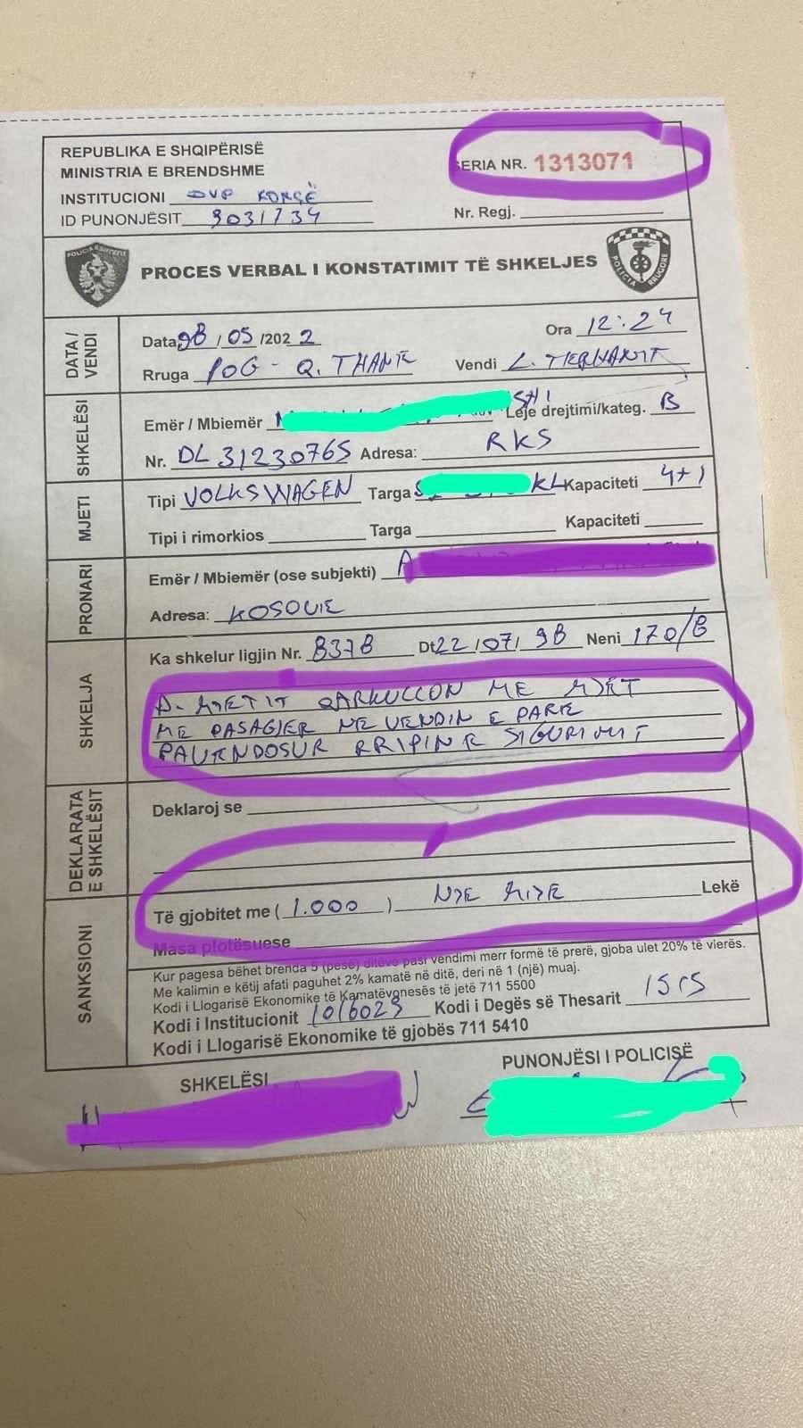 Nga veprimet hetimore të kryera pas sekuestrimit të bllokut të masave admistrative të punonjësit të policisë E.Q., rezulton se masa administrative me numrin përkatës të serisë është me vlerë 1 mijë lekë, gjë e cila tregon mospërputhje me fletën e masës administrative të paraqitur nga denoncuesi.