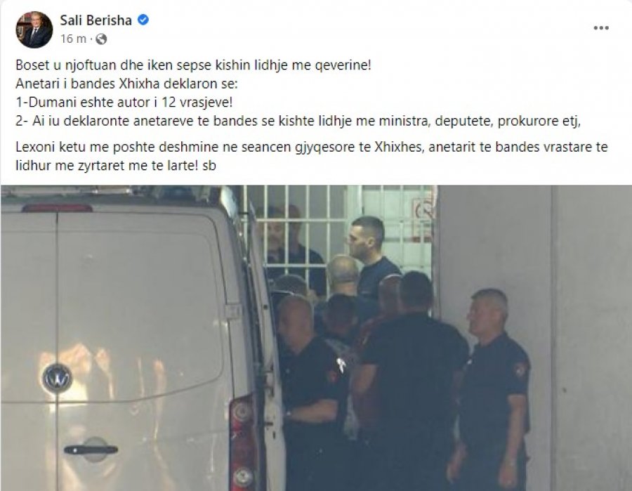 Gjithashtu, Berisha ka postuar dëshminë e Besjan Xhixhës, që ka thënë se Nuredin Dumani ka kryer 12 vrasje dhe se ka deklaruar se ka lidhje me ministra e prokurorë.