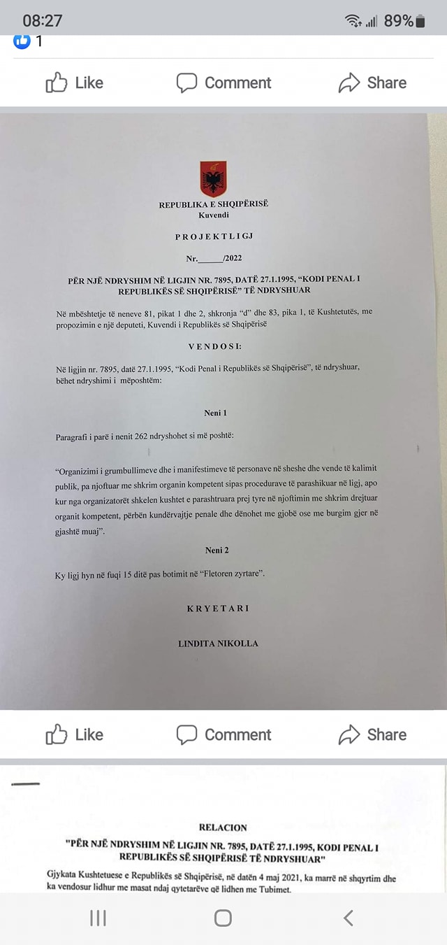 Projektligji i pare permbush Vendimin e Gjykates Kushtetuese qe shfuqizoi ne Kodin Penal ndalimin per zhvillimin e protestave pa lejen e policisë.