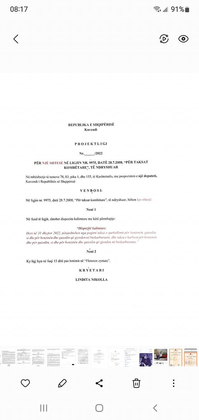 Si dhe nje Projektligj per Cmimin e Naftes duke pezulluar Taksen e Qarkullimit dhe te Karbonit.