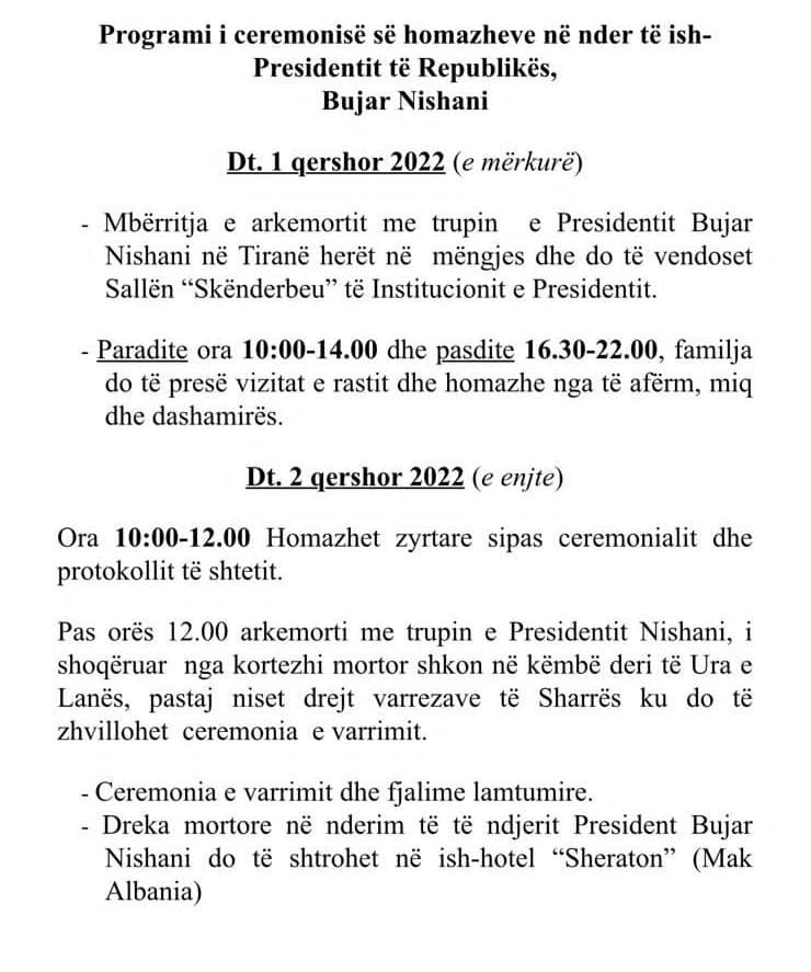 Ndërkohë ditën e enjte nga ora 10:00 deri në 12:00 do të mbahen homazhet zyrtare sipas ceremonialit të protokollit të shtetit.