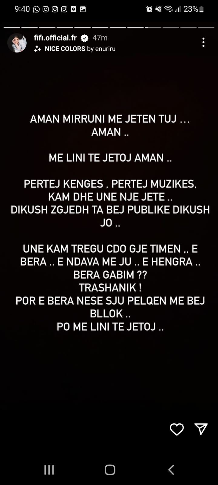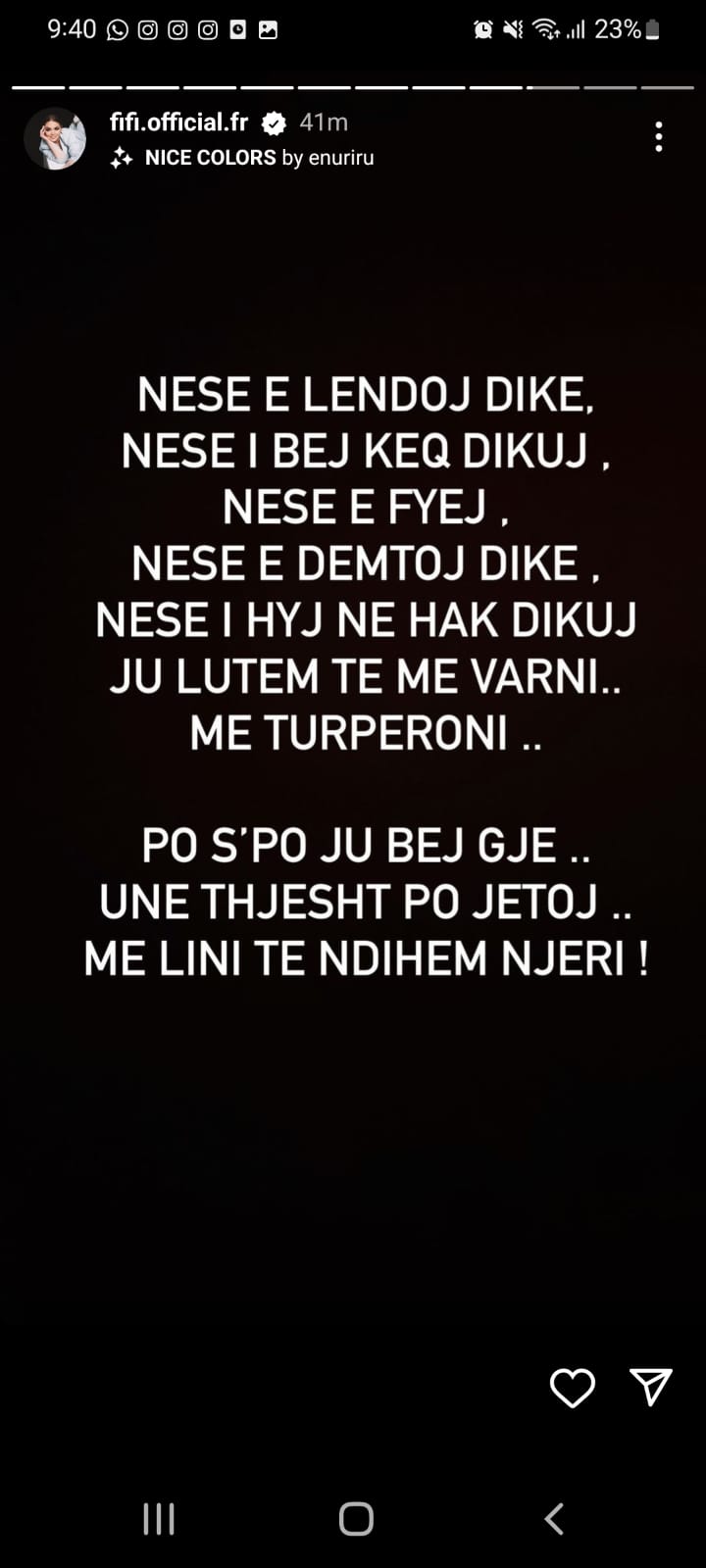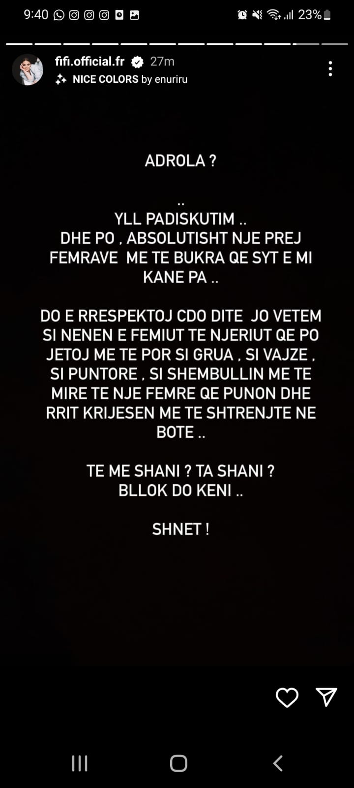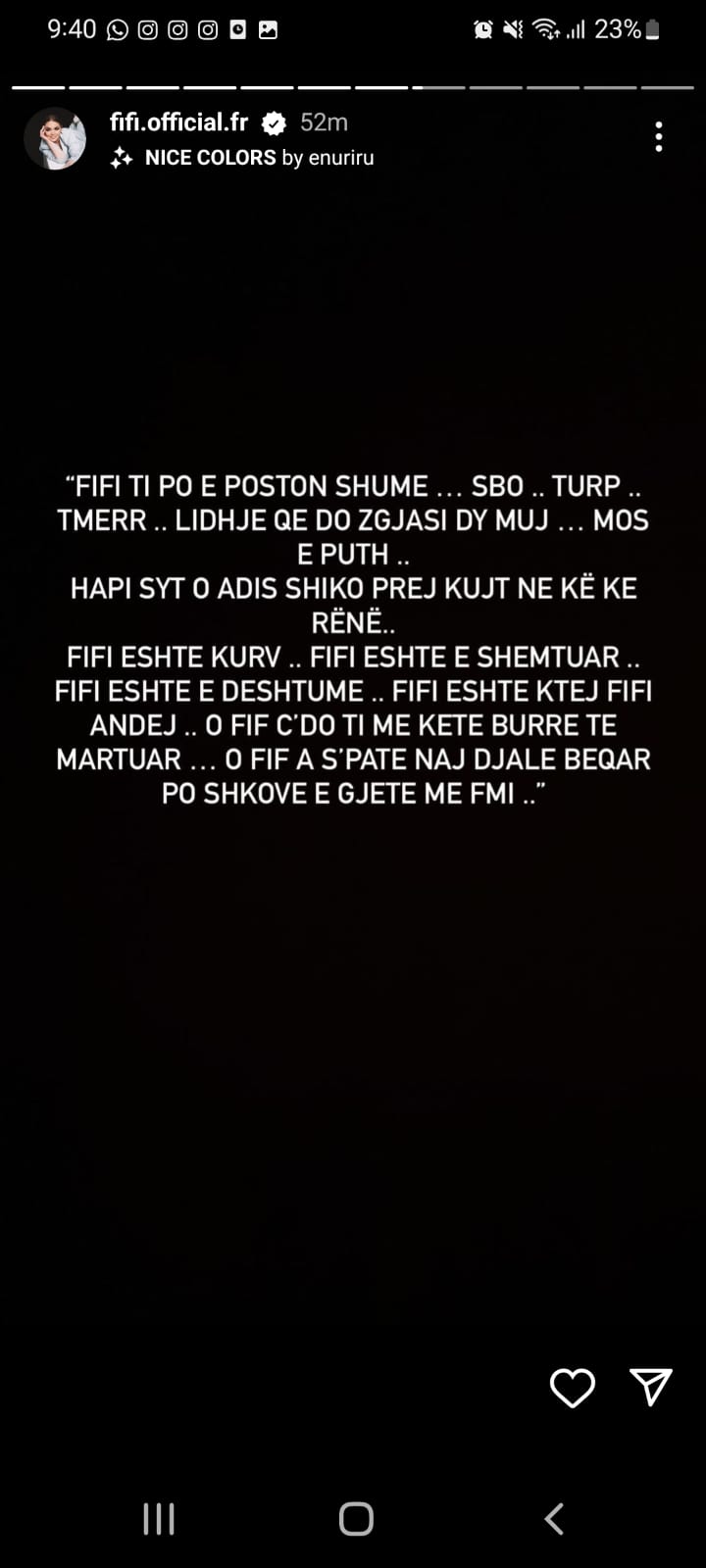 Së fundmi ajo publikoi edhe një mesazh ofendues që nxiti edhe reagimin e saj më tutje. Fifi reagoi me disa postime të njëpasnjëshme në llogarinë e saj në Instagram duke i dalë në mbrojtje të dashurit të saj dhe ish-bashkëshortes.