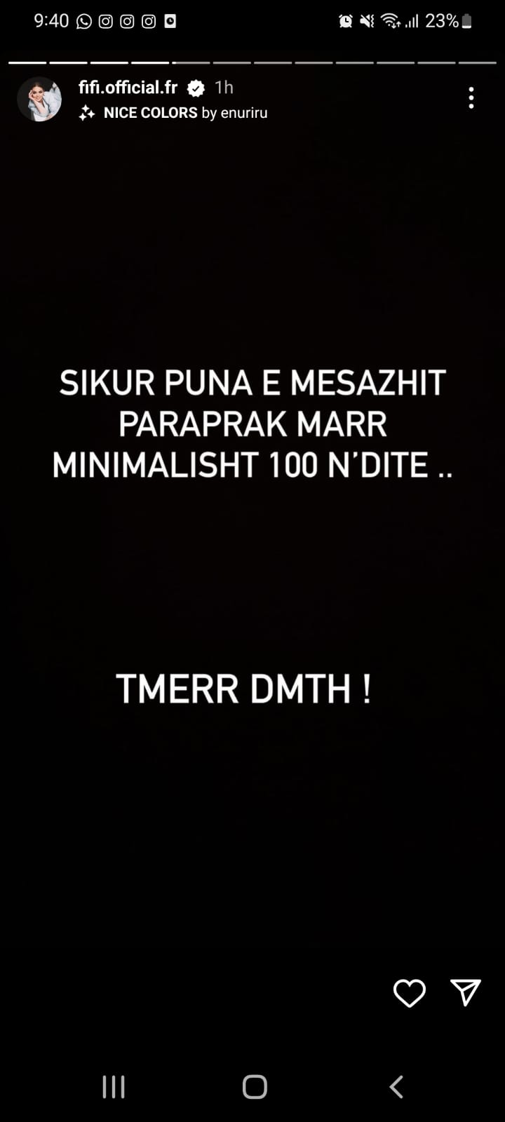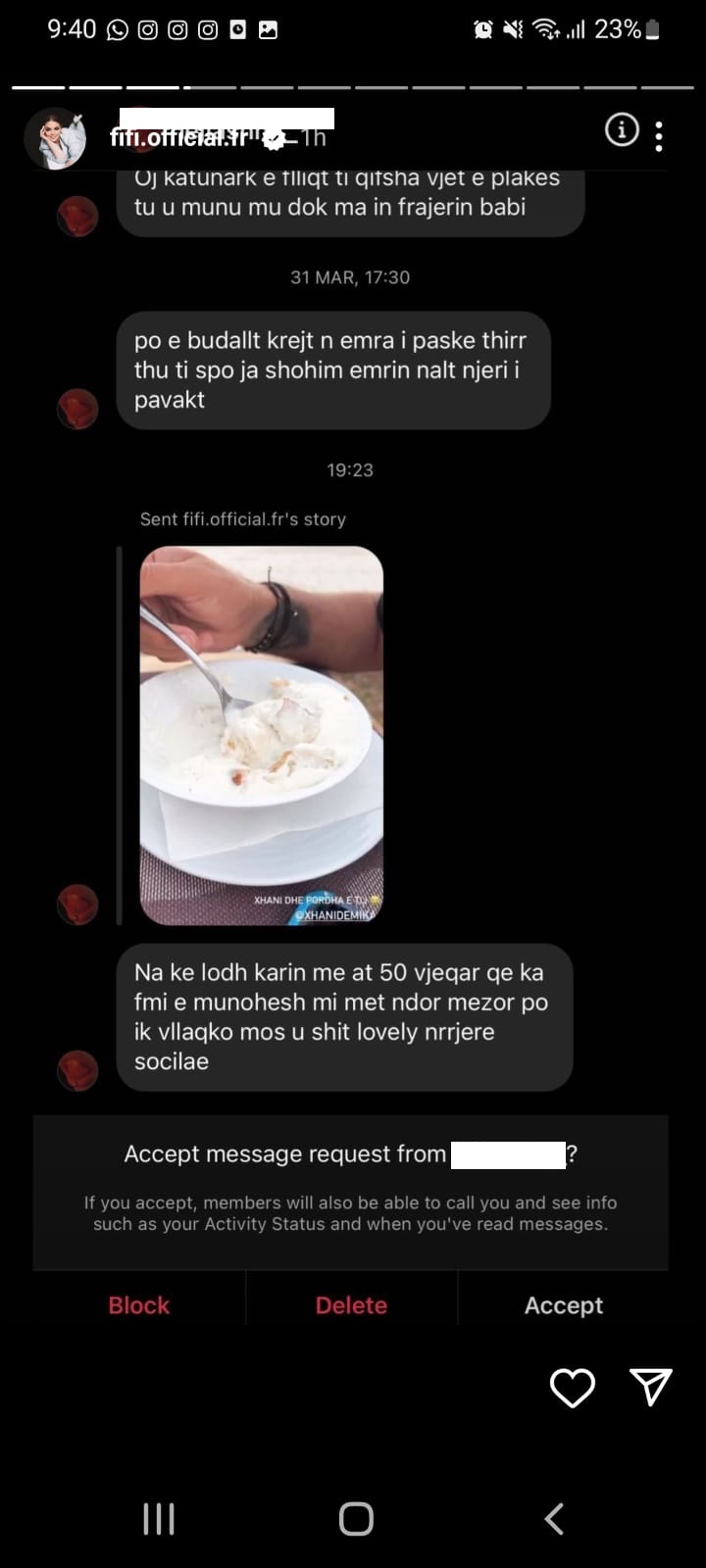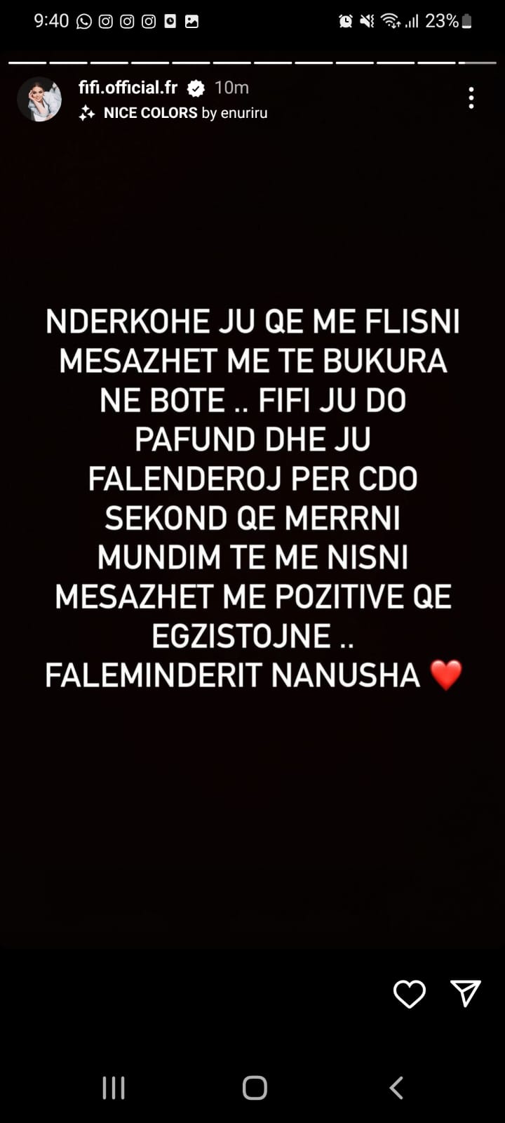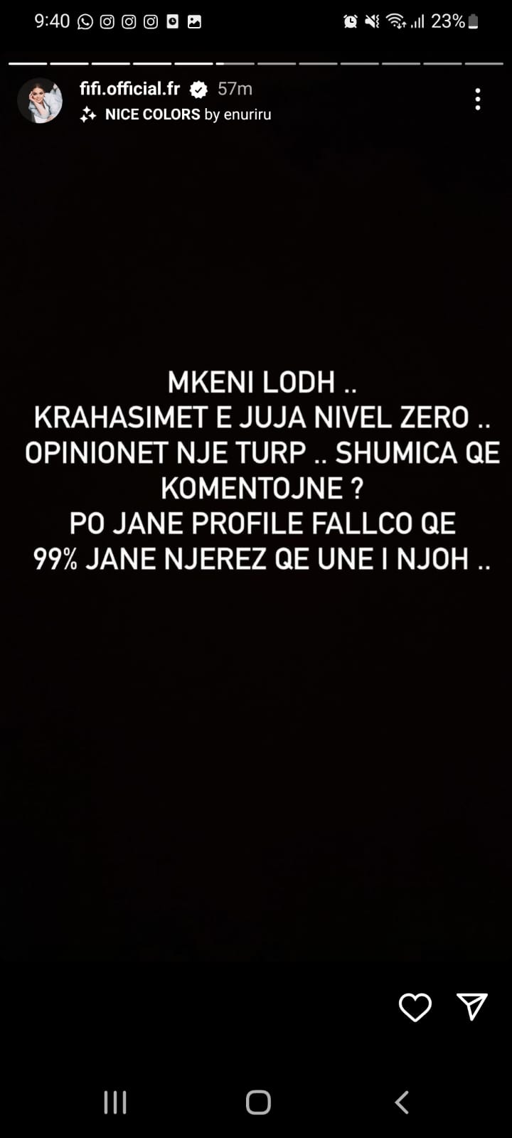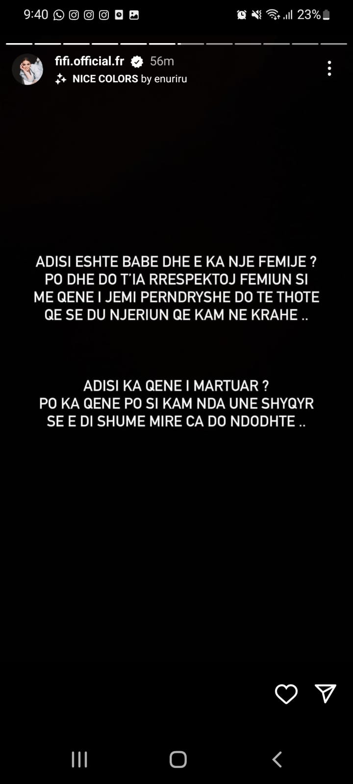 Së fundmi ajo publikoi edhe një mesazh ofendues që nxiti edhe reagimin e saj më tutje. Fifi reagoi me disa postime të njëpasnjëshme në llogarinë e saj në Instagram duke i dalë në mbrojtje të dashurit të saj dhe ish-bashkëshortes.