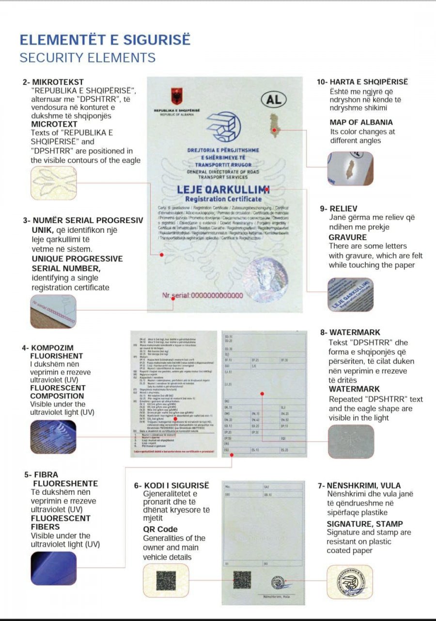 Që nga cilësia e letrës duke bërë atë të rezistente ndaj dëmtimeve, logo e “Deas së Butrintit” me hologramë, mikrotestet e vendosura në konturet e dukshme të Shqiponjës ku shkruhet “Republika e Shqipërisë” dhe “DPSHTRR”, kompozimet fluoreshente të dukshme vetëm në rezet ultravioletë, harta e Shqipërisë me ngjyrë që ndryshon në këndë të ndryshme shikimi, tekste me reliev, janë vetëm disa nga elementë që i janë shtuar lejes së re të qarkullimit të mjeteve, njofton RTSH.