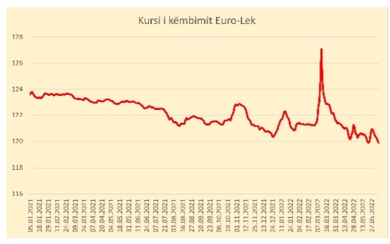 Euro u këmbye të martën me 119.92 Lekë, shumë pranë vlerës prej 119.91 Lekë të regjistruar në 23 maj dhe që përfaqëson nivelin më të ulët të të gjitha kohërave në kursin e këmbimit Euro-Lek.