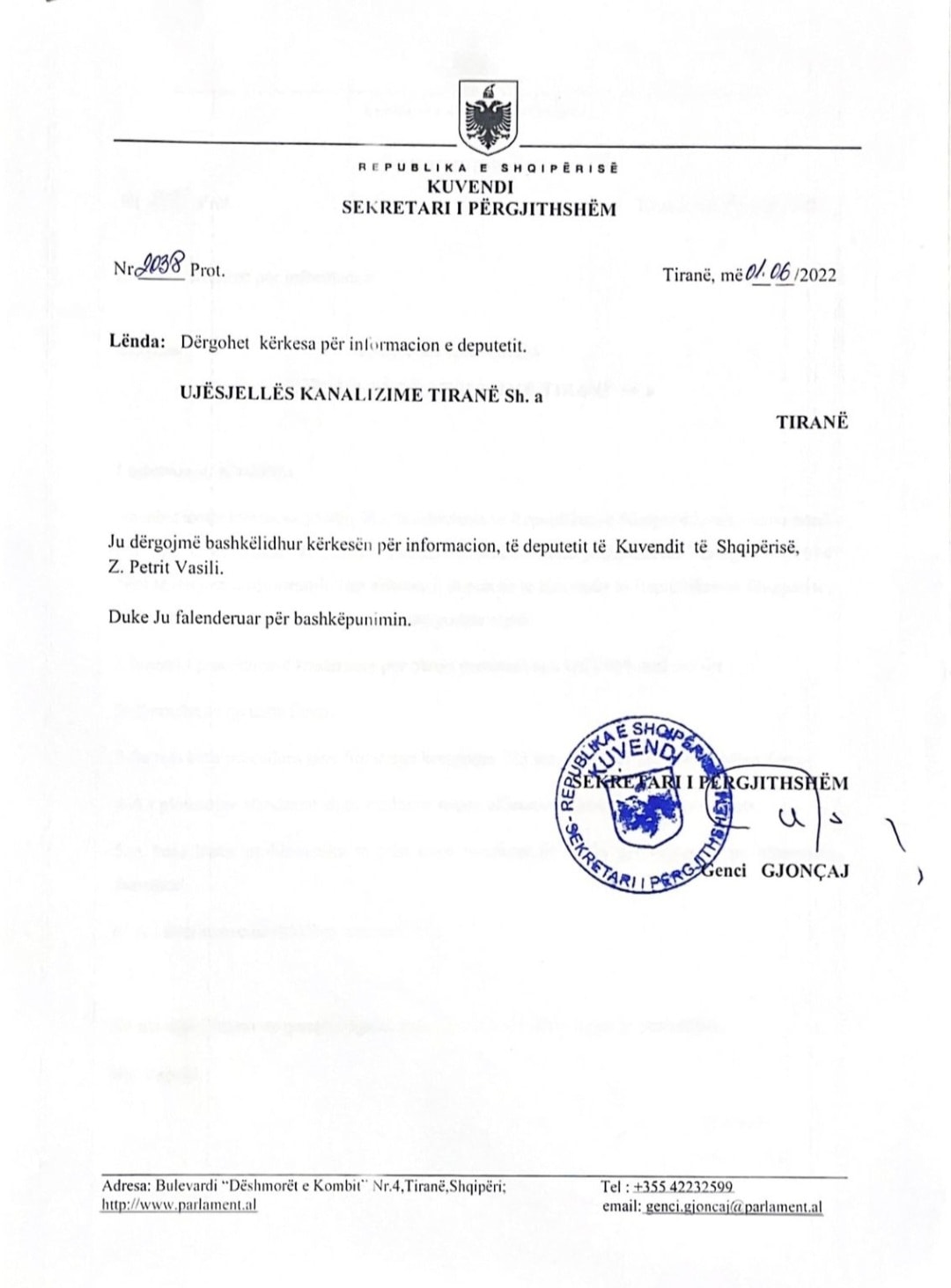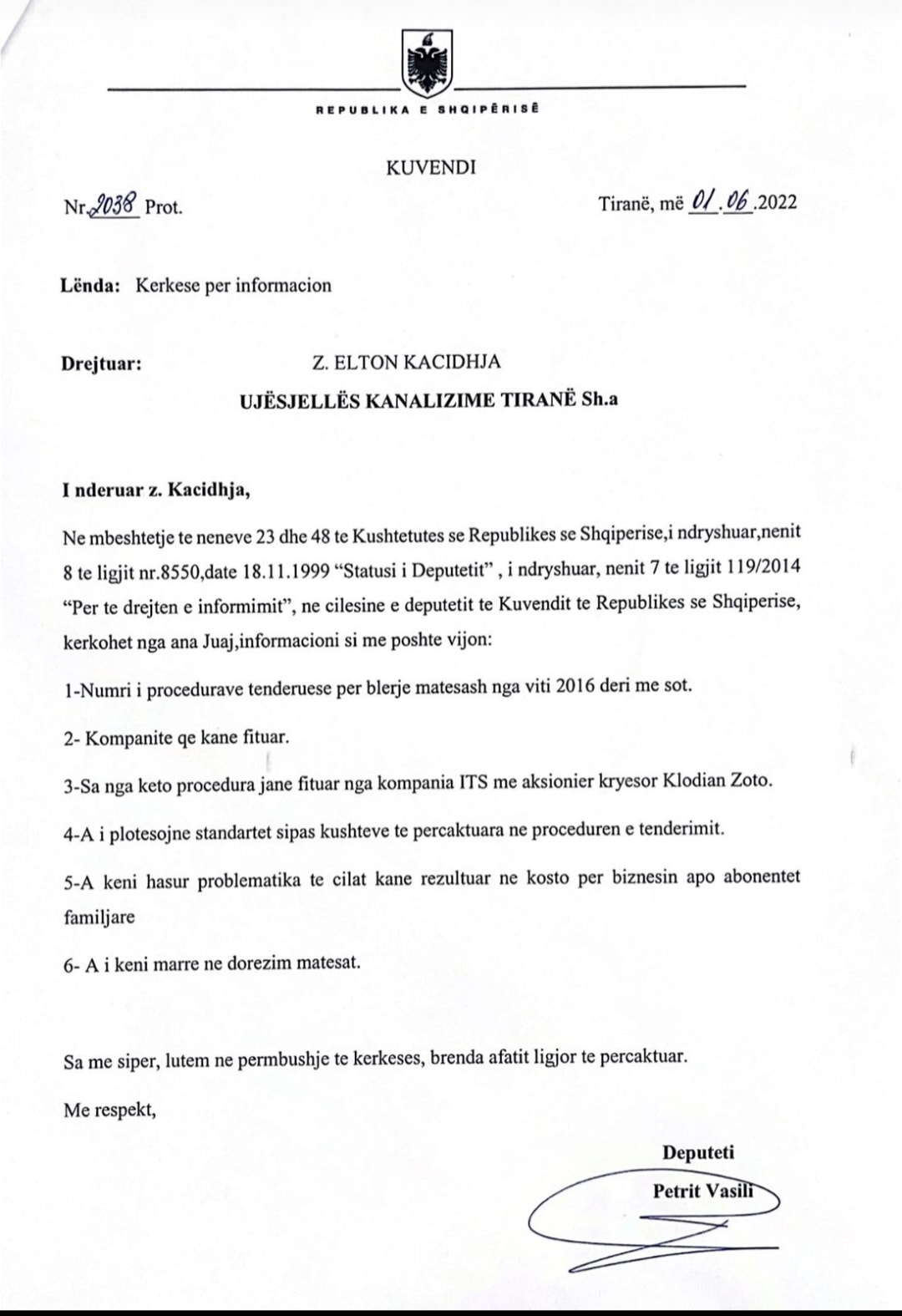 Nënkryetari i LSI-së, Petrit Vasili i është drejtuar me shkrezë zyrtare Drejtorisë së Ujësjellës Kanalizimeve të Tiranës, ku kërkohen informacione lidhur me procedurat tenderuese për blerje matësash nga viti 2016 e deri më sot, cilat kompani kanë fituar, e sa nga këto procedura janë fiktuar nga kompania me aksioner kryesor Klodian Zoton.