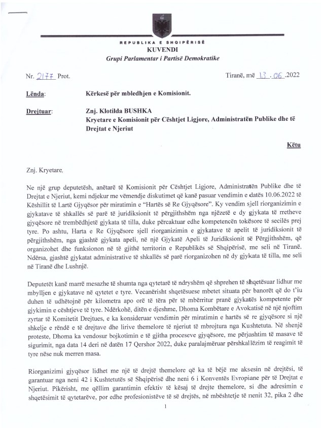 Tetë deputetë të Partisë Demokratike kanë kërkuar seancë dëgjimore me Këshillin e Lartë Gjyqësor, Këshillin e Lartë të Prokurorisë, Ministrin e Drejtësisë, Dhomën Kombëtare të Avokatisë, Avokatin e Popullit dhe Komitetin Shqiptar të Helsinkit për hartën e re gjyqësore.