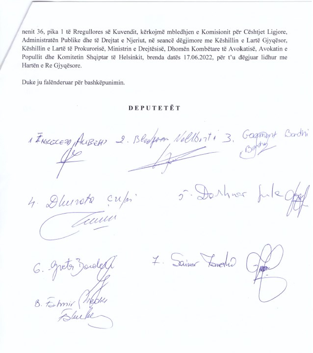 Dhurata Çupi, Enkelejd Alibeaj, Gazment Bardhi, Saimir Korreshi, Bledion Nallbati, Dashnor Sula, Greta Bardeli dhe Fatmir Mediu shprehen në një kërkesë drejtuar kryetares së komisionit të ligjeve se kanë marrë mesazhe të shumta nga qytetarë të ndryshëm, të cilët janë të shqetësuar lidhur me mbylljen e gjykatave në qytetet e tyre.