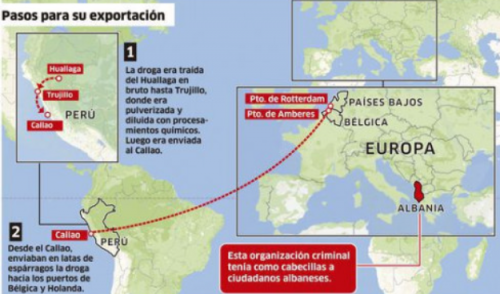 Për policinë e antidrogës mafia shqiptare do të tentojë sërish eksportin e drogës. “Kjo mafie e drejtuar nga shqiptarët kishte si qendër operacioni qytetin Trujillo, ku kishin ngritur të gjithë logjistikën për të transportuar drogën përmes portit të Callaos. Destinacioni i tyre ishin portet e Evropës, kryesisht Roterdami, në Holandë dhe Antëerpi në Belgjikë”, shpjegoi kreu i i Dirandros, koloneli PNP Cesar Echevarria Cabrejos.