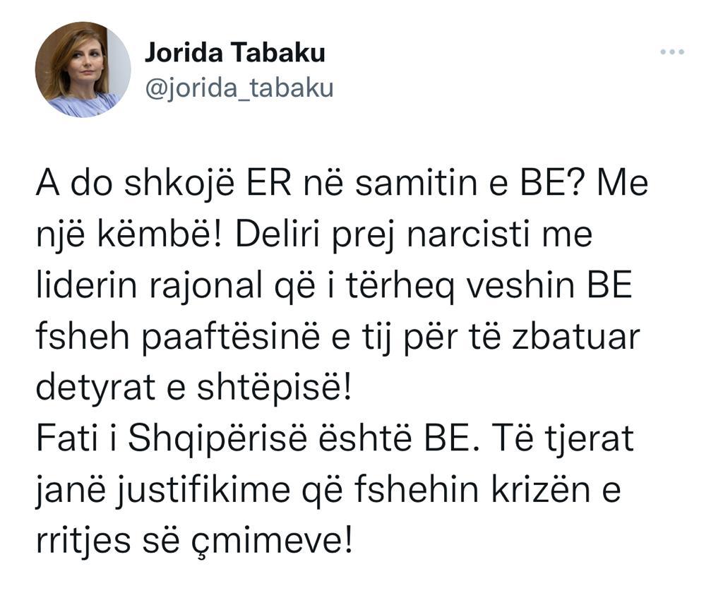 Në një postim në Tuitter, Tabaku thotë se “deliri prej narcisti me liderin rajonal që i tërheq veshin BE fsheh paaftësinë e tij për të zbatuar detyrat e shtëpisë!”.