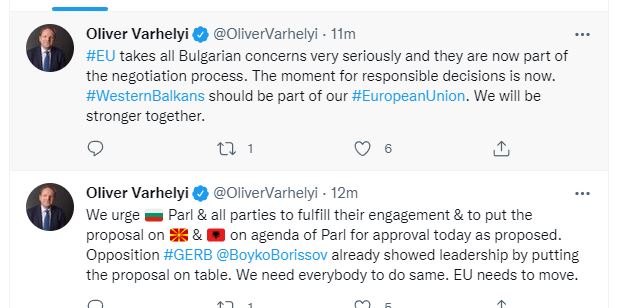 “Ne i bëjmë thirrje Parlamentit bullgar dhe të gjitha palëve që të përmbushin angazhimin e tyre dhe ta vendosin propozimin në axhendën e Kuvendit për miratim sot siç është propozuar. Opozita e Boyko Borissov tashmë ka treguar lidership duke e hedhur propozimin në tryezë. Ne kemi nevojë që të gjithë të bëjnë të njëjtën gjë. BE-ja duhet të lëvizë”, shkruan Varhelyi.