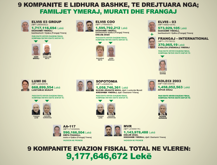 “Ka blerje korruptive, të ndara në fatura të vogla, nuk blihet ne llogari bankare që lëvizja financiare mos bëhet me llogari bankare por kesh, e shitja nga fruta ekzotike në beton është bërë me pagesë bankare, por pagesat bankare nuk janë kryer. Përveç se pagesat nuk kryhen, kompanitë që kanë bërë blerje marrin e rimbursimin e TVSH.Pse nuk reagon shteti? Se kjo gjë bëhet në bashkëpunim me qeverinë dhe institucionet që janë të lidhura drejtpërdrejt. Janë 9 kompani, Ymeraj, Murati, Frangaj, për të humbur gjurmët, kompanitë shiten në persona të tjerë, pra blej fruta, shit zhavorr, blej ujë e shit hekur. Këta dy pensionistë kanë blerë biznese me 30 milionë dollarë. Gjithë ky evazion fiskal sot që bëjmë denoncimin kompania nuk gjendet”, tha Kryemadhi.