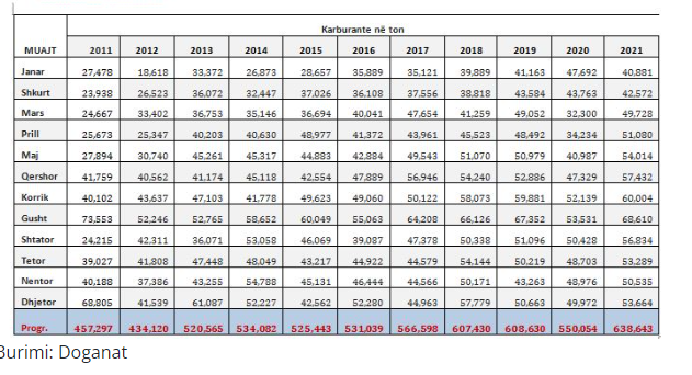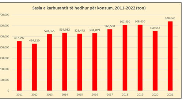 Sipas të dhënave të Doganave, ndër vite konsumi i karburantit ka trend rritës dhe rekordin historik e ka arritur në vitin 2021 me shifrën prej 638,643 ton.