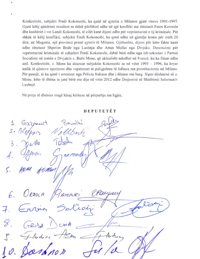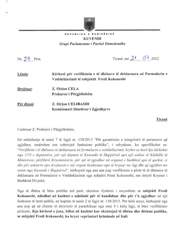 “Nga të dhëna të bëra publike më parë, ekziston dyshimi i arsyeshëm se subjekti Fredi Kokoneshi, ndodhet në kushtet e ndalimit për të kandiduar dhe për t’u zgjedhur ne një funksion të lartë publik, në kuptim te nenit 2 te ligjit nr. 138/2015. Për këtë arsye, kërkojmë nga ana juaj që në zbatim të detyrimit të parashikuar nga neni 8 i këtij ligji, të bëni verifikimin përkatës. Kjo kërkesë e jona, bëhet në kushtet kur ekzistojnë të dhëna dhe dëshmi publike, se subjekti Fredi Kokoneshi, ka kryer veprimtari kriminale në Itali”, thuhet në shkresën drejtuar kryeprokurorit.
