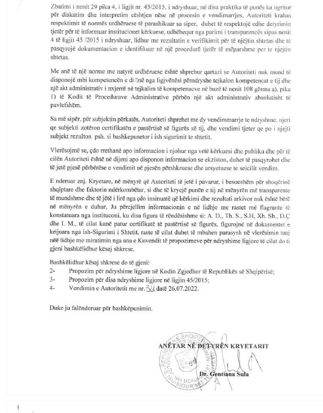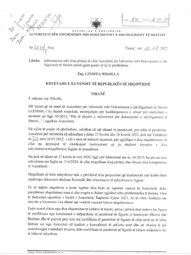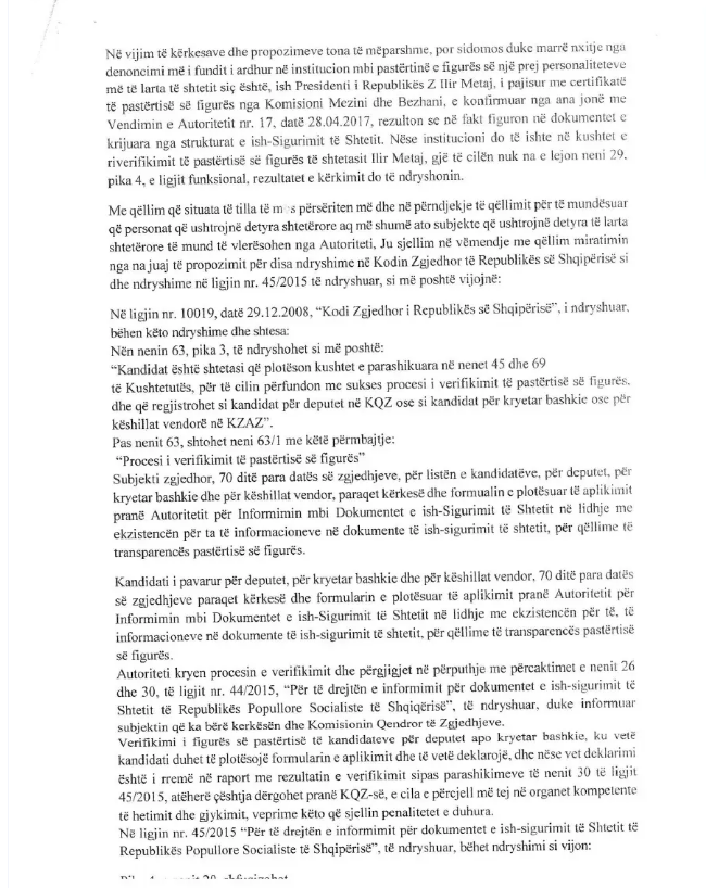 “Në vijim të kërkesave dhe propozimeve tona të mëparshme, por sidomos duke marrë nxitje nga denoncimi më i fundit i ardhur në institucion mbi pastërtinë e figurës së një prej personaliteteve më të lartë të shtetit, siç është ish-presidentit i Republikës, Ilir Metaj, i pajisur me vertifikatë të pastërsisë së figurës nga Komisioni Mezini dhe Bezhani, e konformuar nga ana jonë me vendimin e autoritetit nr. 17, datë 28.04. 2017, rezulton se në fakt figuron në dokumentet e krijuara nga strukturat e ish-sigurimit të shtetit. Nëse institucioni do të ishte në kushtet e riverifikimit të pastërtisë së figurës së shtetasit Ilir Meta, gjë të cilën nuk na e lejon neni 29, pika 4, e ligjit funskional, rezultatet e kërkimit do të ndryshonin. Ju përcjellim informacionin në lidhje me rastet më flagrantë të konstatuara nga institucioni, ku disa figura të rëndësishme, si A.D, Th.S, S.H, Xh.Sh, D.Ç dhe I.M, të cilat kanë pasur certifikatë të pastërtisë së figurës, figurojnë në dokumentet e krijuara nga ish-sigurimi i shtetit, raste të cilat duhet të mbahen parasysh në vlerësimin tuaj në lidhje me miratimin nga ana e Kuvendit të propozimeve për ndryshime ligjore”, thuhet në dokument.