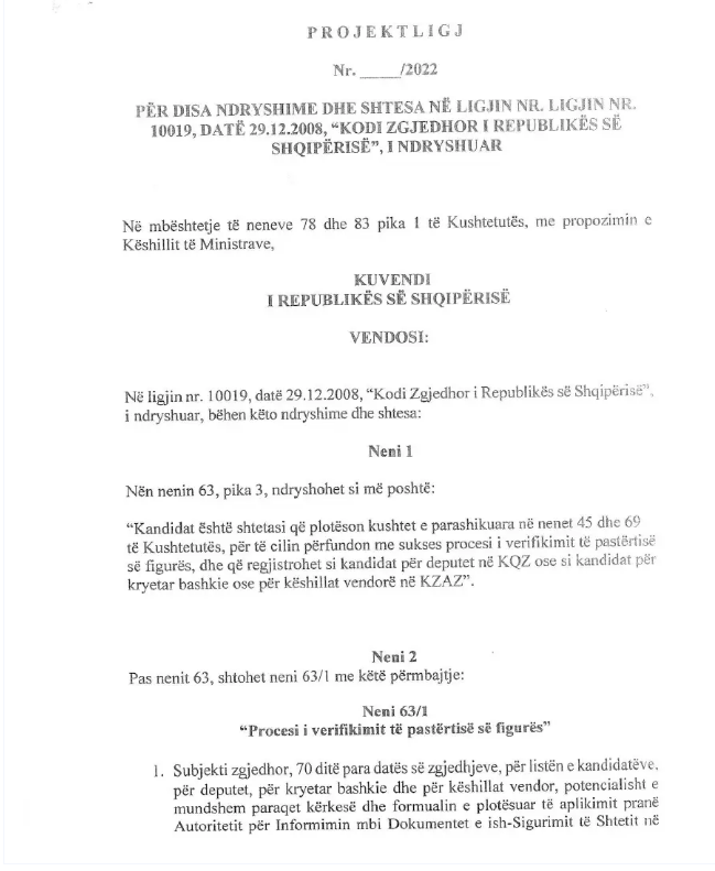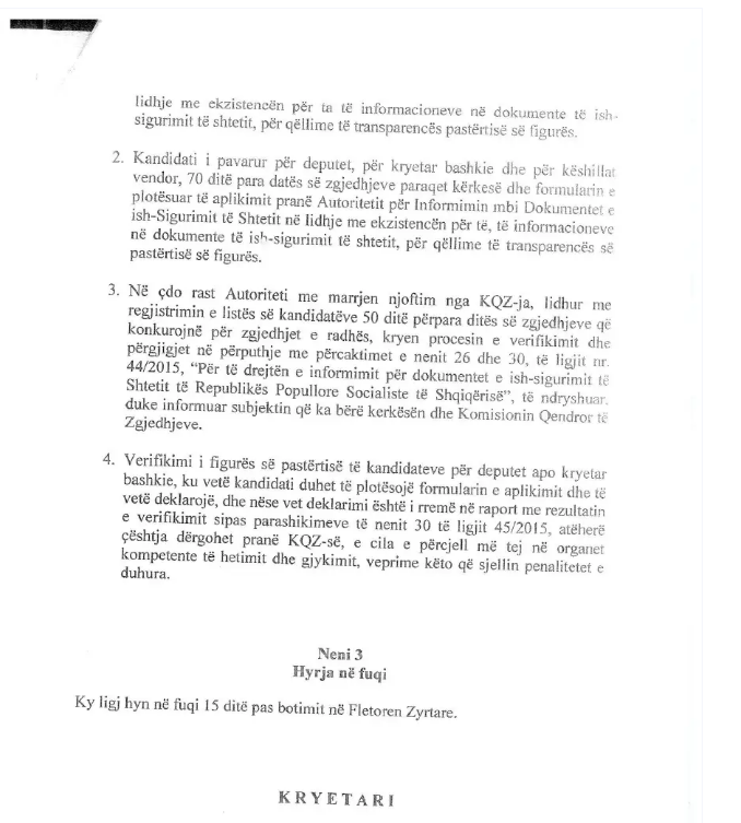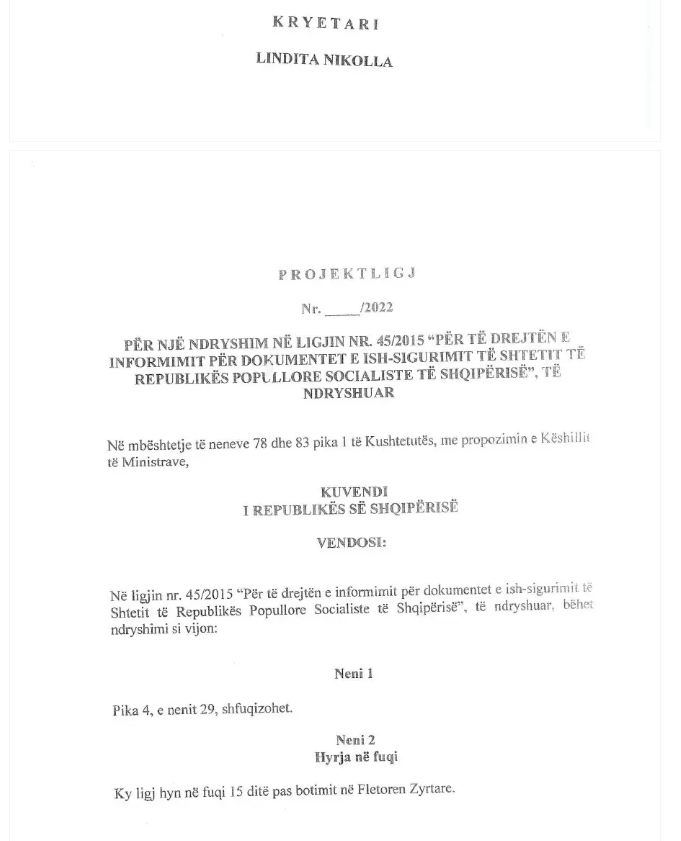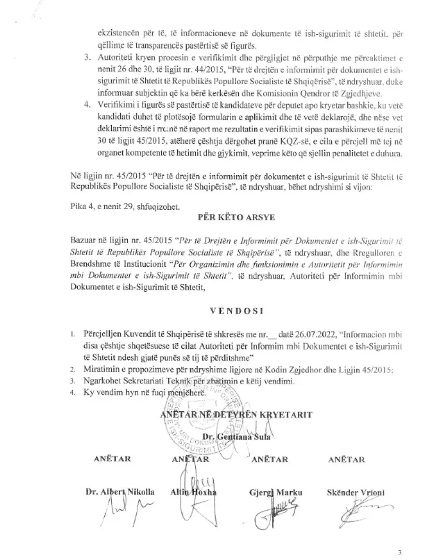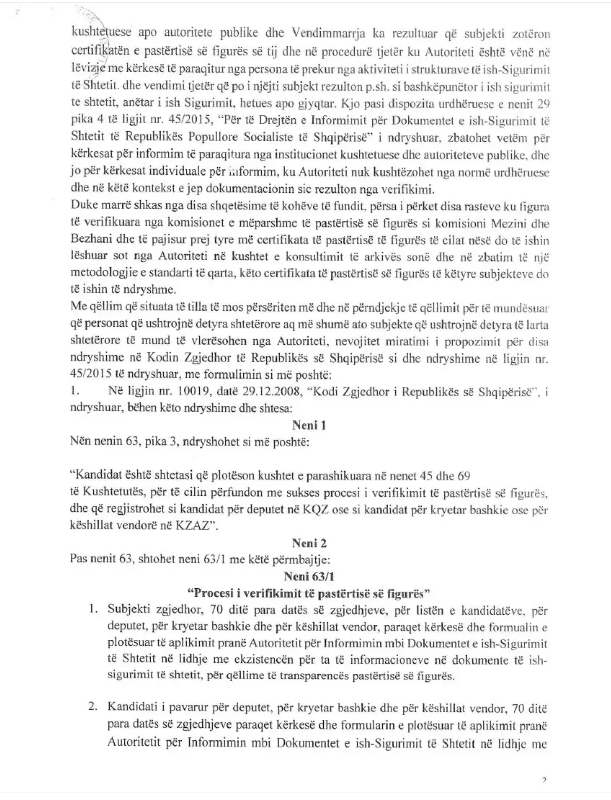 Me këtë shkresë, Autoriteti i Dosjeve i kërkon Kuvendit ndryshime ligjore në mënyrë që të jetë ky institucion që të kryejë verifikimet për personat e përcaktuar ligjërisht (kandidat për deputet, kryetar bashkie apo këshilltarë bashkiak), nëse kanë pasur ose jo lidhje me ish-Sigurimin.
