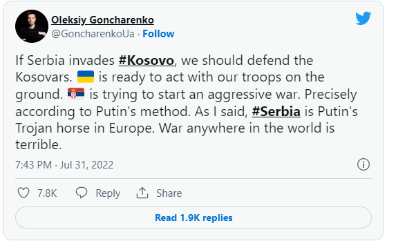“Nëse Serbia pushton Kosovën, ne duhet të mbrojmë kosovarët. Ukraina është gati të veprojë me trupat tona në terren. Serbia po përpiqet të nisë një luftë agresive. Pikërisht sipas metodës së Putinit. Siç thashë, Serbia është kali i Trojës i Putinit në Europë. Lufta kudo në botë është e tmerrshme”, ka shkruar Goncharenko.