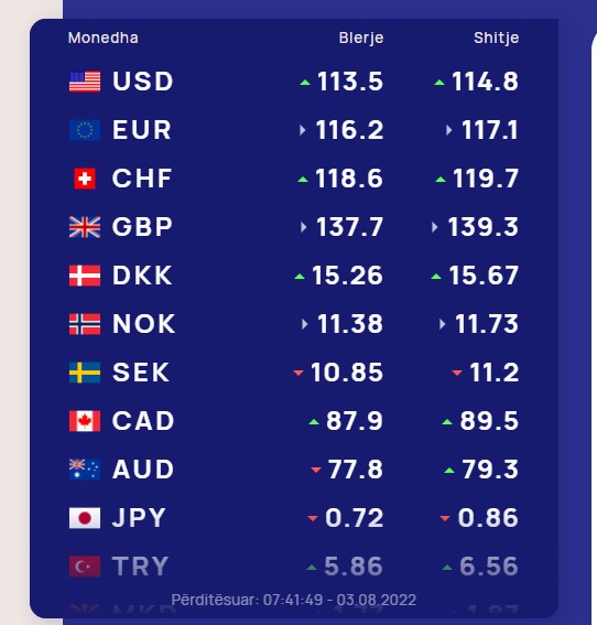 Monedha evropiane euro blihet sot me 116.2 lekë dhe shitet me 117.1 lekë, duke shënuar një rritje të lehtë krahasuar me datën 2 gusht.