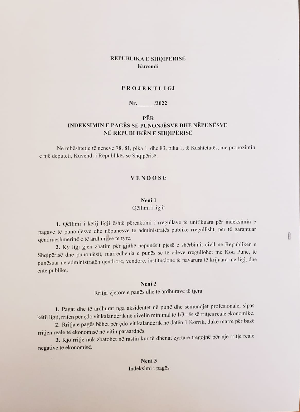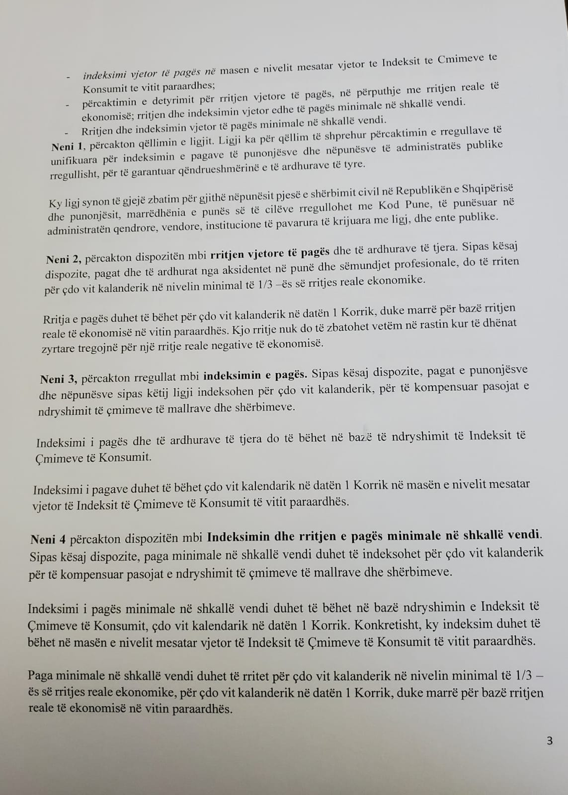 “Përmes këtij projektligji synohet mbrojtja e punonjësve nga rritja e çmimeve. Rritja dhe indeksimi i pagës minimale i rëndësishëm të përfshihet në ligj. Rritja dhe indeksimi i pagave ka vetëm efekte pozitive ekonomike dhe sociale. Bën përfitues të drejtpërdrejtë punonjësit. Rritja e pagës rrit nxitjen e konsumit. Mundëson përmirësimin e bilancit të sigurimeve. Indeksimi i pagave detyrim, të bëhet në 1 korrik të çdo viti”, tha Meta.