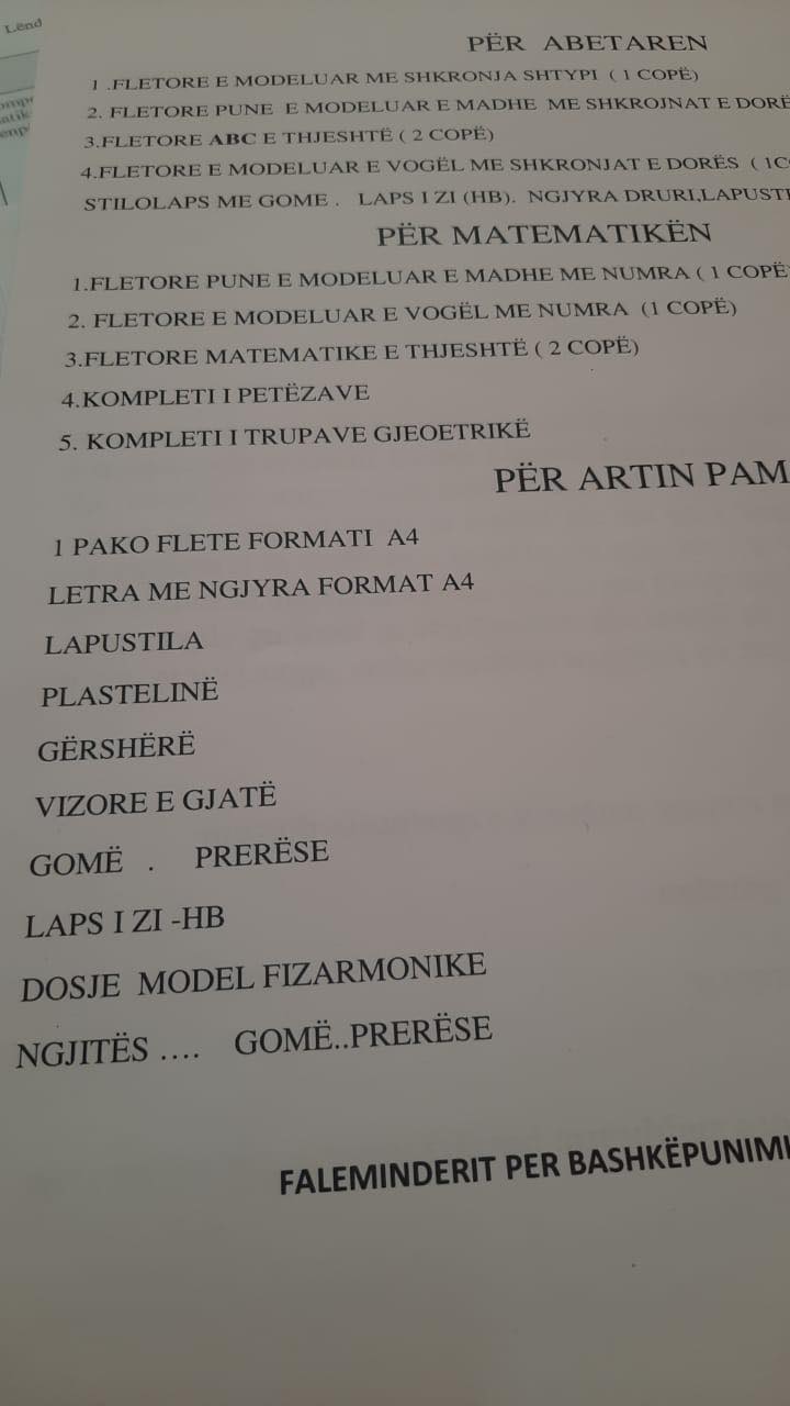 -Lista vijon me kutinë e ndihmës së shpejtë, detergjentët, mjetet ngrohëse, perdet e të tjerë artikuj të domosdoshëm që ka detyrimin t’i sigurojë vetë shkolla se prandaj paguajmë taksa.