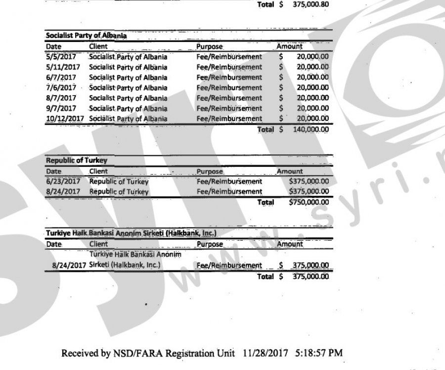 Sipas dokumentit, rezulton se kompania lobuese, veç 140 mijë dollarëve me firmë të Fugës ka marrë edhe mbi 1 milionë dollarë nga Turqia, nga të cilat 750 mijë dollarë nga Qeveria e Turqisë dhe 350 mijë të tjera nga HalkBank, e cilësuar si “Banka e Erdogan” dhe hetuar nga SHBA për transaksione të dyshimta madje edhe për thyerje embargoje ndaj Iranit.