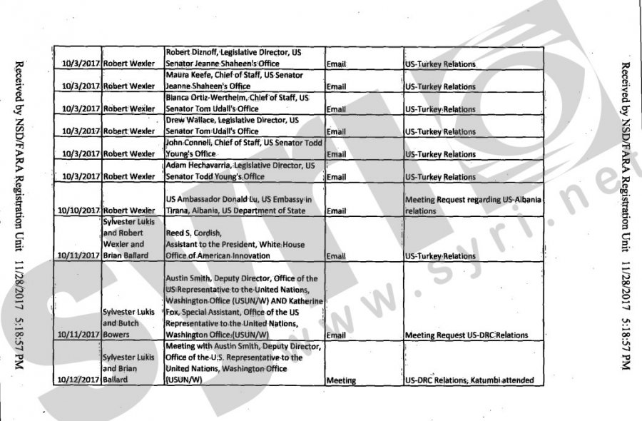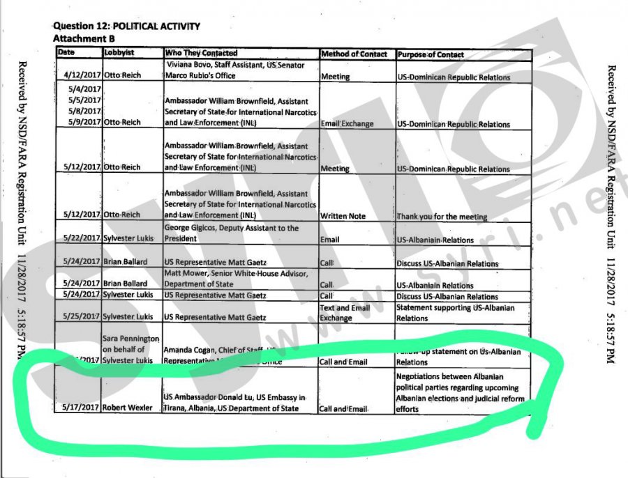 Në dokumentin e siguruar, që i takon vitit 2017, rezulton se lobistët kanë pasur kontakte të vazhdueshme me ambasadorin e asaj kohe në Tiranë, Donald Lu. Për të arritur suksesin në lobimin e saj, kompania “Ballard Partners”, kontraktoi si konsulent dhe ndërmjetësues ish-kongresmenin demokrat Robert Wexler.