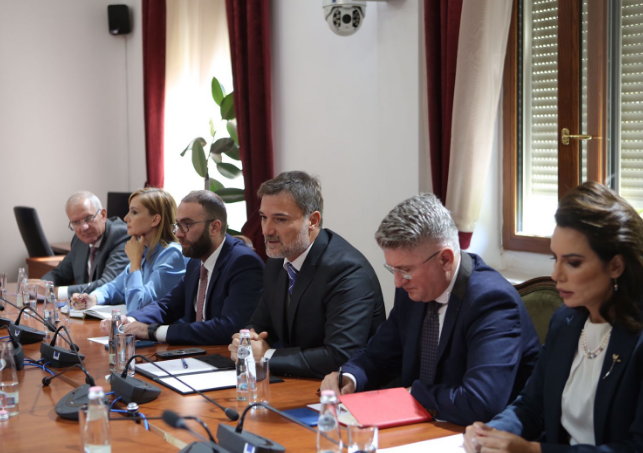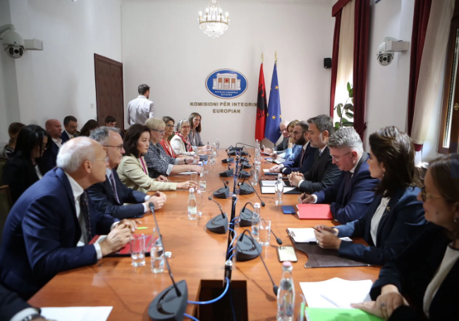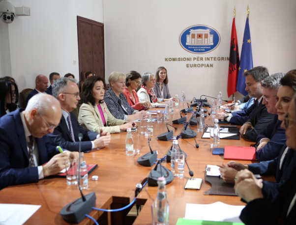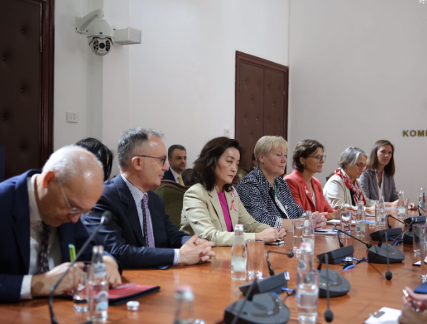 Kim po zhvillon një takim me deputetët e PD, Enkelejd Alibeaj, Dhurata Çupi, Jorida Tabaku, Grida Duma, Agron Gjekmarkaj dhe Gazmend Bardhi, ndërkohë që përkrah saj janë rreshtuar edhe kolegët e selive diplomatike më në zë në Tiranë.
