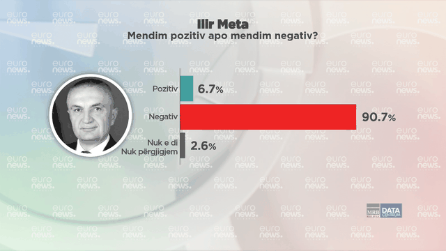 Figura më pak e pëlqyer është kryetari i Partisë së Lirisë, Ilir Meta, ku 90.7% e të targetuarve e kanë vlerësuar negativisht. Ndërsa vetëm 6.7% e tyre kanë shprehur vlerësim pozitiv.