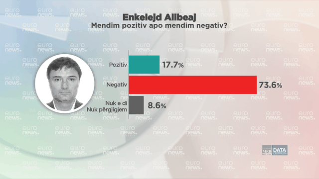 Basha pasohet nga deputeti i PD, Enkelejd Alibeaj, i cili për pak kohë mbajti drejtimin e PD, ku për të, 73.6% e të targetuarve kanë mendim negativ dhe vetëm 17.7% e tyre kanë mendim pozitiv.