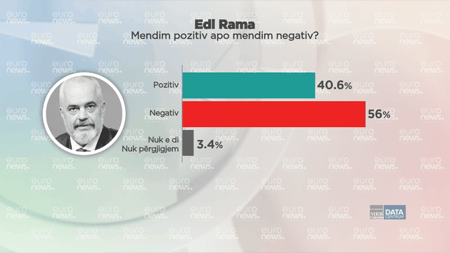 Shqiptarët sot nuk pëlqejnë asnjë nga figurat politike në vendin tonë. Të pyetur nga Barometri në Euronews Albania, 56% e tyre kanë shprehur mendim negativ për kryeministrin Edi Rama, ndërsa 40.6% kanë qasje pozitive ndaj figurës së tij.