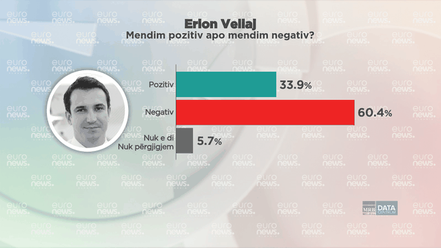 Qasjen më negative në rradhët e qeverisjes në krahasim me kryeministrin, e ka kryetari i Bashkisë Tiranë. Erion Veliaj është vlerësuar negativisht nga 60.4% e të pyeturve dhe 33.9% e tyre e kanë vlerësuar pozitivisht.