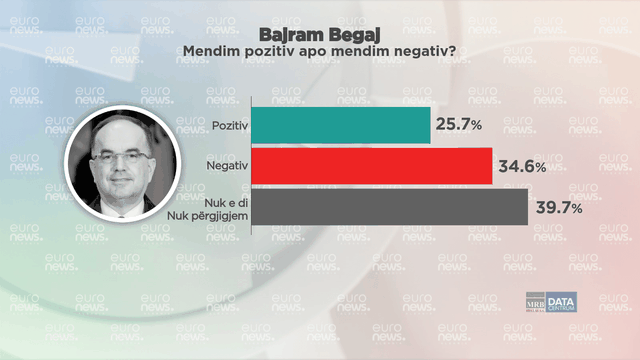 Presidenti i vendit, Bajram Begaj nuk ka marrë shifrën më ta lartë as negative e as pozitive, pasi 39.7% e të targetuarve nuk kanë një mendim të qartë për figurën e tij. Ndersa 34.6% e kanë vlerësuar negativisht dhe 25.7% e kanë cilësuar si pozitiv presidentin e ri.