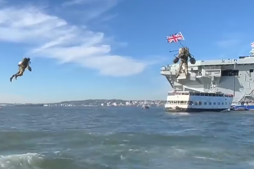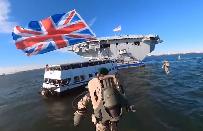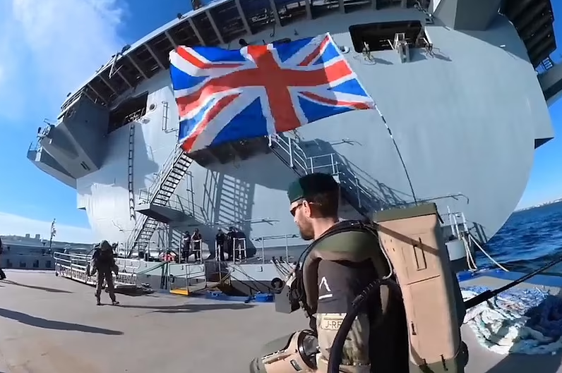 Dy ushtarë britanikë shihen duke përdorur “JET PACKS” dhe dalin jashtë luftëanijes HMS Queen Elizabeth gjatë stërvitjes anglo-amerikane.
