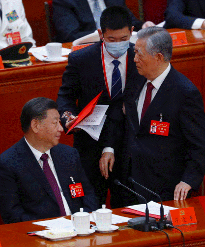 Edhe pse Jintao ishte ulur në krahun e majtë të Xi, ai u nxorr jashtë qartazi pa dëshirën e tij, me Presidentin që dhuroi disa mimika të çuditshme në momentin e shoqërimit të parardhësit nga rojet e sigurisë.