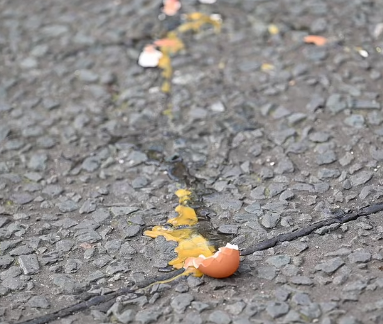 Pamjet e publikuara nga media britanike tregojnë breshërinë e vezëve që fluturojnë pranë Madhërisë së Tij dhe thyhen në tokë ndërsa ai po përshëndetej nga drejtuesit e qytetit.