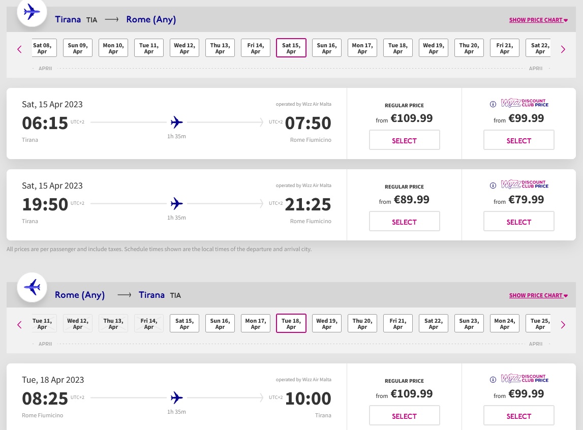 Nëse pret sot një biletë për në Romë për datën 15 prill, çmimi më i lirë për në vajtje është 90 euro dhe kthimi është 110 euro, pra bileta në total kushton 200 euro. Edhe në maj, çmimet janë të ngjashme, në rreth 180 euro vajtje dhe ardhje.