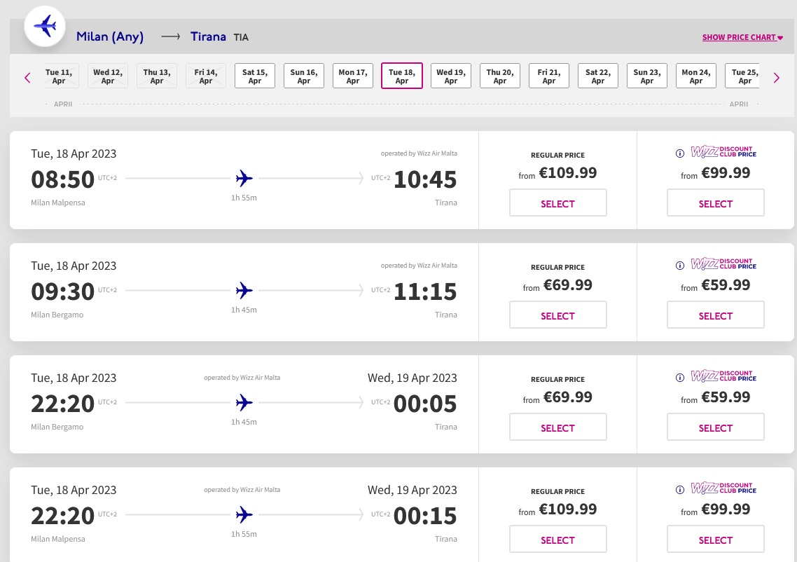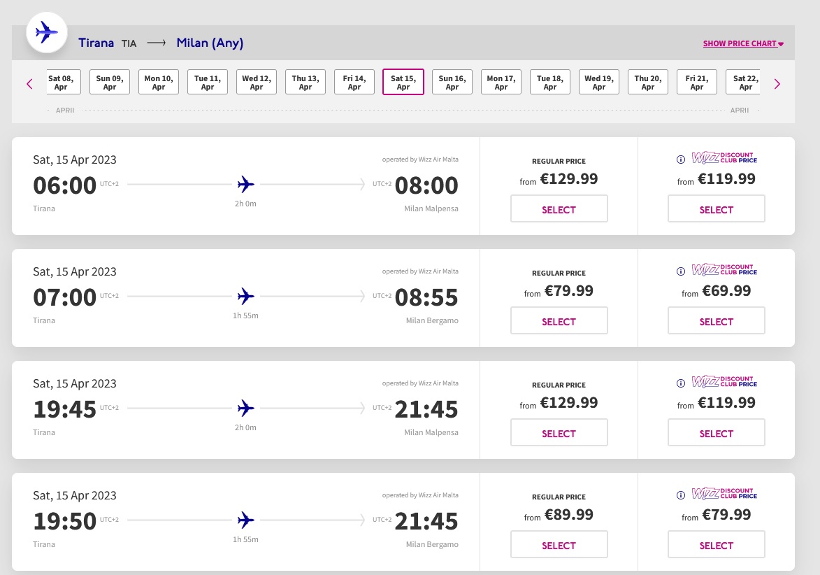 Në prill, më e lirë për në Milano është Air Albania. Nëse prenoton sot për vajtje në datën 15 prill ka vetëm dy vende me çmim promocional 37.5 euro dhe më pas bileta kushton 112 euro. Për kthimin në 18 prill, ka 10 vende me çmim promocional 50 euro dhe pas mbarimit të tyre çmimi shkon në 125 euro.