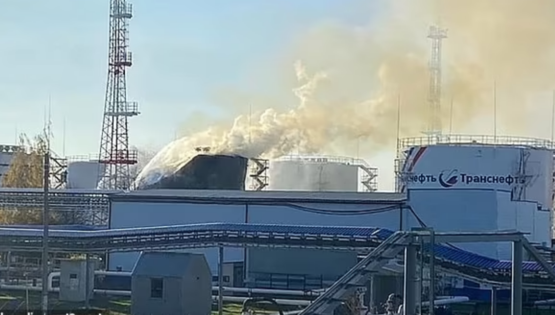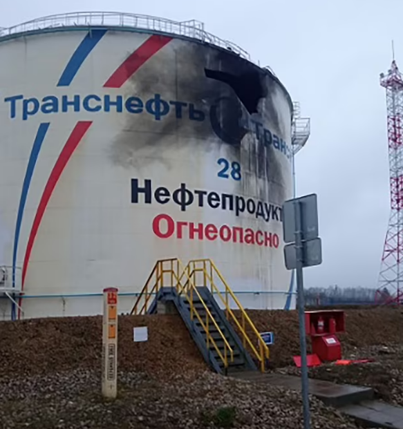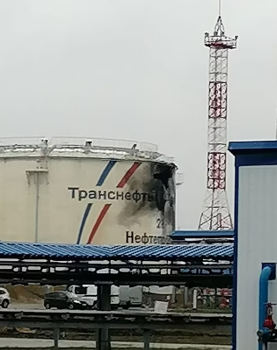 Logoja e operatorit të tubacionit të kontrolluar nga shteti rus “Transneft” mund të shihet në depon e shpërthyer me drone.