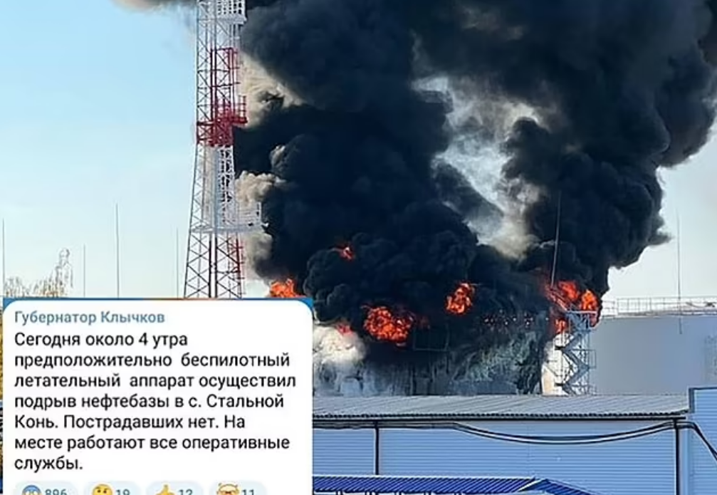 “Sulmi i orës 4 të mëngjesit shpërtheu një depo nafte në Stalnoi Kon. Nuk ka viktima. Të gjitha shërbimet e urgjencës janë duke punuar në vend“, tha guvernatori rajonal Andrey Klychkov.