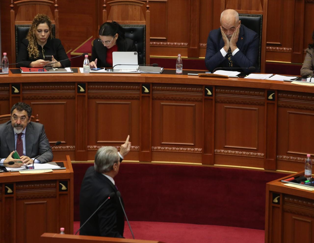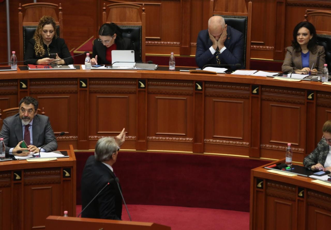 Ndërkohë, në Kuvend ndodhet edhe kryeministrit Edi Rama i cili në momentin që Berisha i drejtohet me gisht për ta bërë fajtor për aferën e portit të Durrësit, vendos duart në kokë.