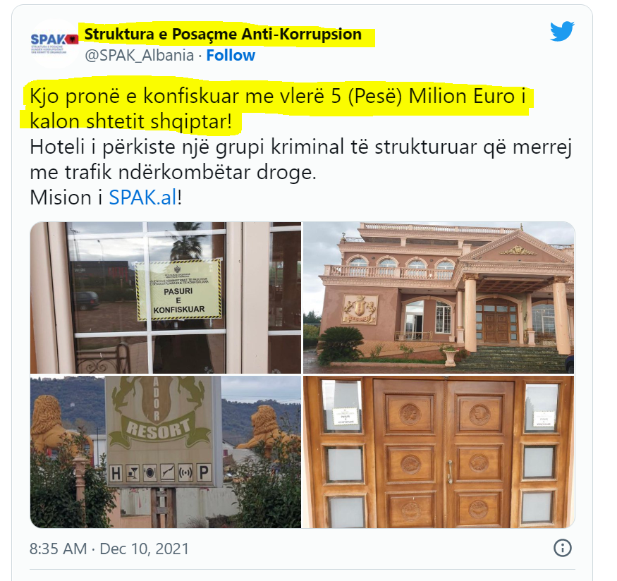 “Kjo pronë e konfiskuar me vlerë 5 (Pesë) Milion Euro i kalon shtetit shqiptar! Hoteli i përkiste një grupi kriminal të strukturuar që merrej me trafik ndërkombëtar droge”, thuhet në njoftimin e SPAK. Pra, me një vlerë 5 milionë euro. Apo, 6 herë me shumë sesa vlera e nxjerrjes në ankand.