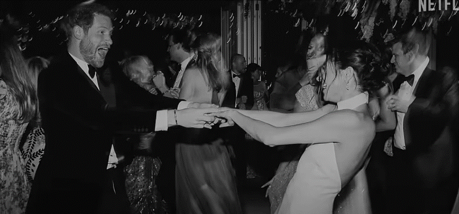 Duka dhe Dukesha e Sussex-it mund të shihen duke kërcyer në dasmën e tyre, ndërsa në një tjetër foto Meghan mund të shihet duke u përqafuar me burrin e saj.